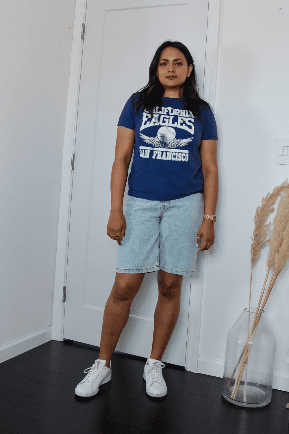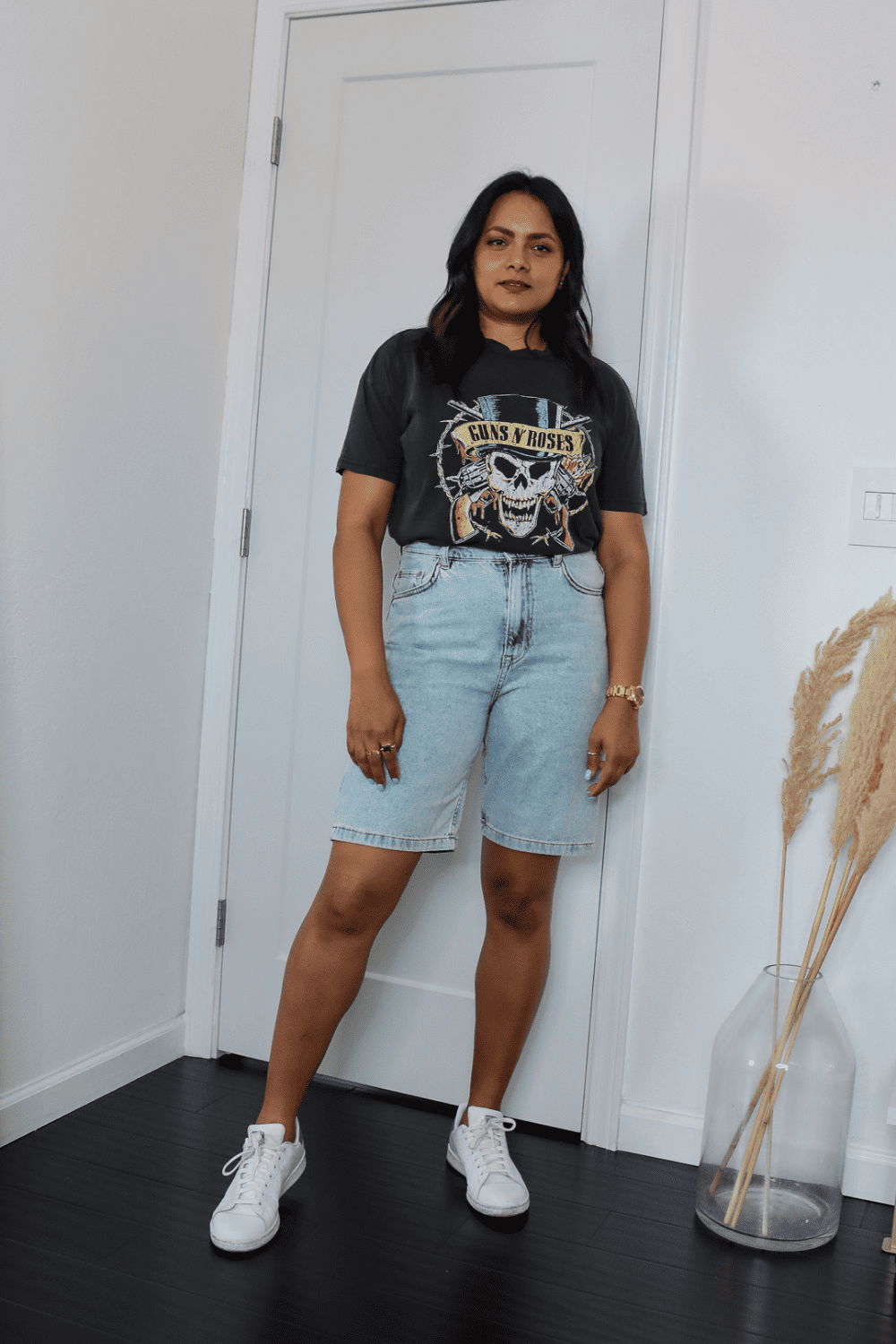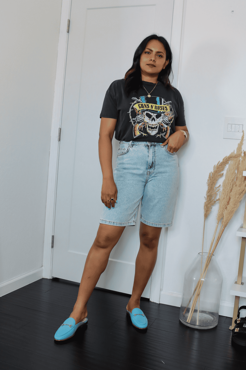 For someone who has shorter torso, short shorts look really short on me. But you could be wearing these long shorts for other reasons like you actually prefer them and they are also easy to wear to office. I have often seen these shorts worn in a certain way and wanted to show how you can still wear these shorts with a T shirt but transform it into something more elevated and stylish.