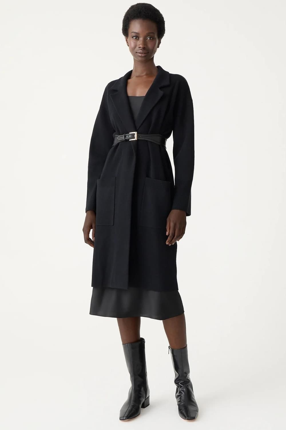 If you are a petite and feel like the long coats drown you, then you can wear a sweater blazer instead. A sweater blazer is much more comfortable than a regular blazer even if it’s fitted.