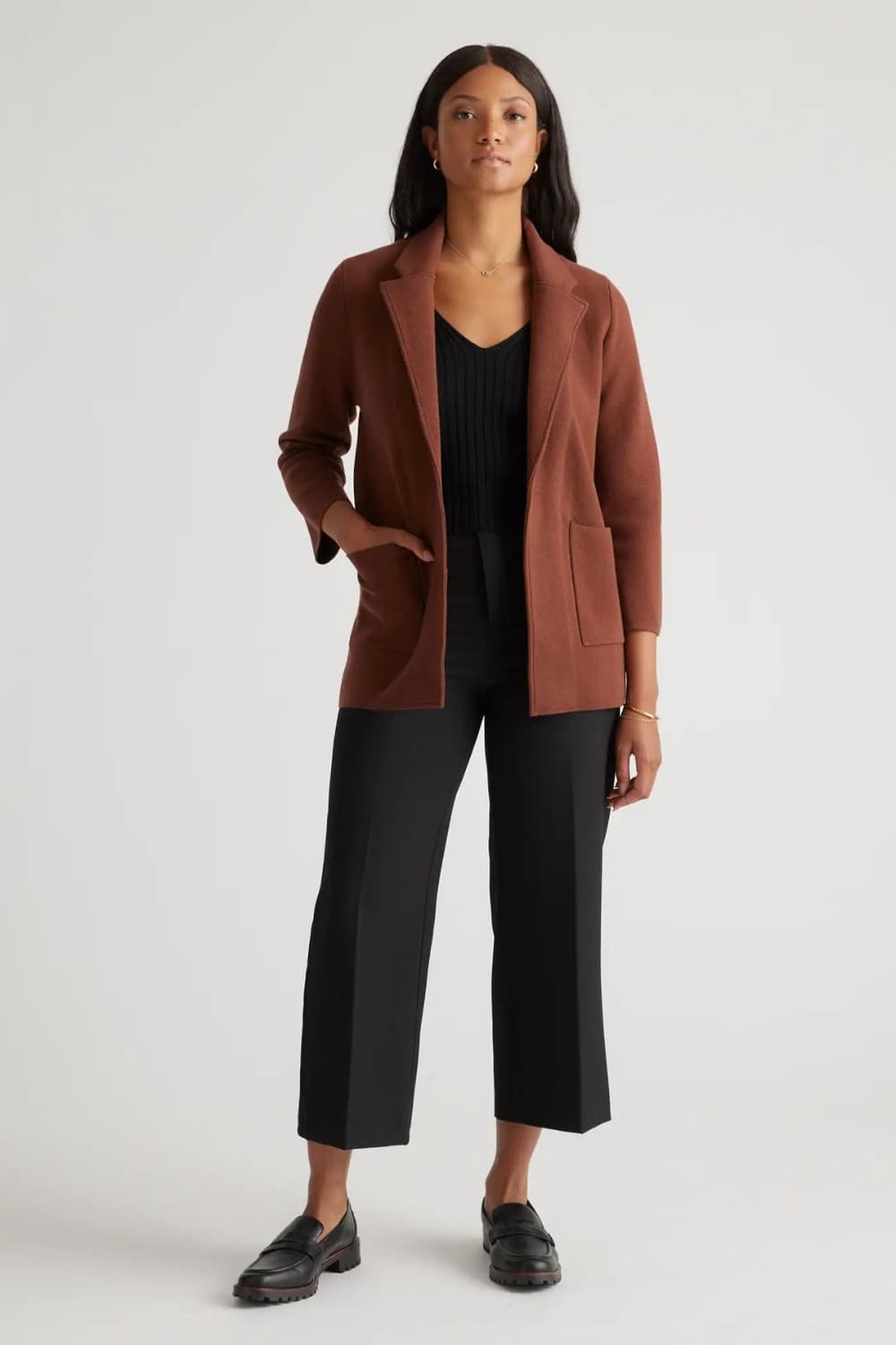 The Quince organic cotton sweater blazer is comfortable, made out of natural fabric so it won’t feel itchy over short sleeve or sleeveless tops. And it’s long enough to fall on your thighs, so you can still wear leggings with it.