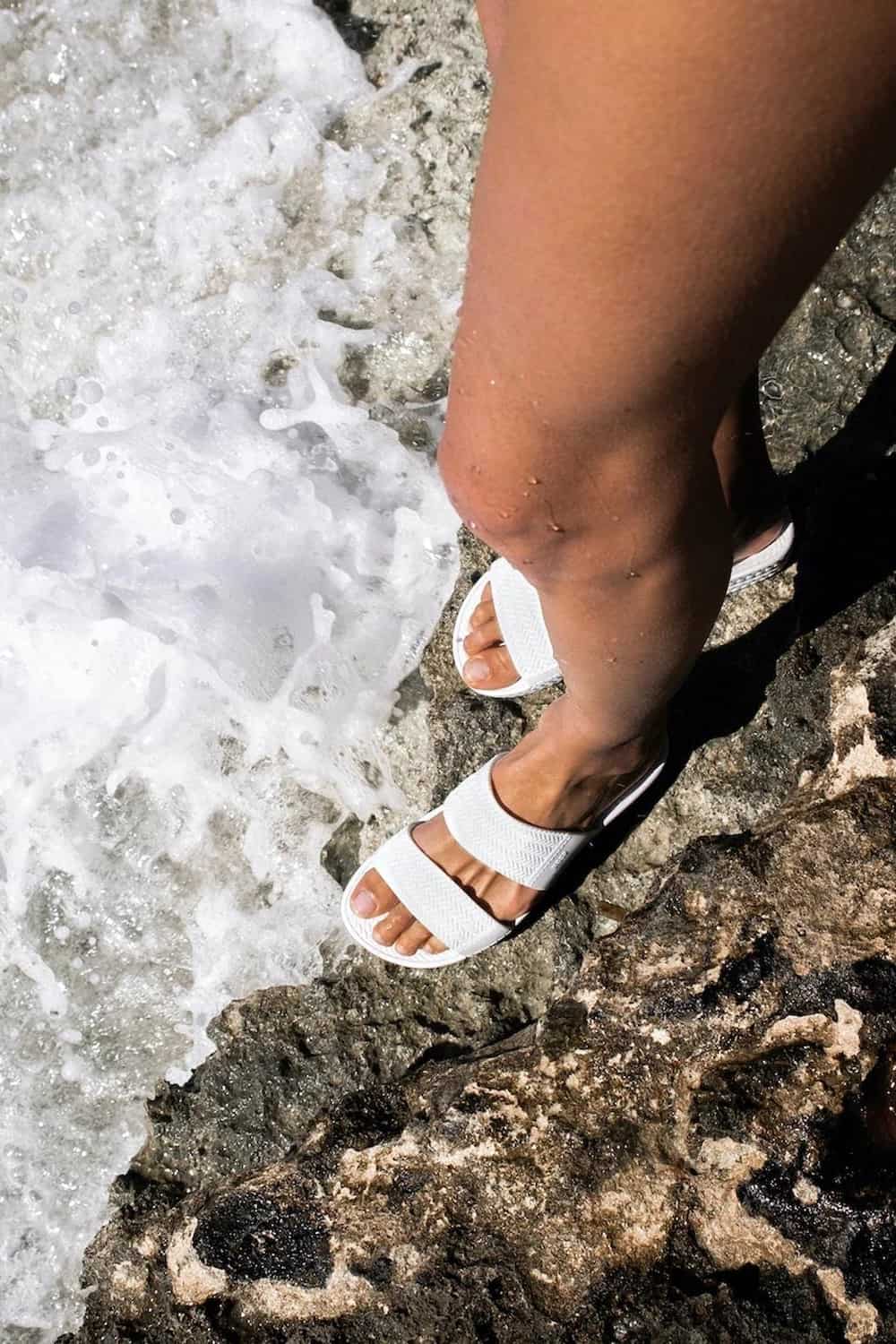 The Reef Water Vista Slides are one of the most popular waterproof slides you can get under $100. They have squishy soles, so they are comfortable for all day wear and you can even wear them to rocky beaches.