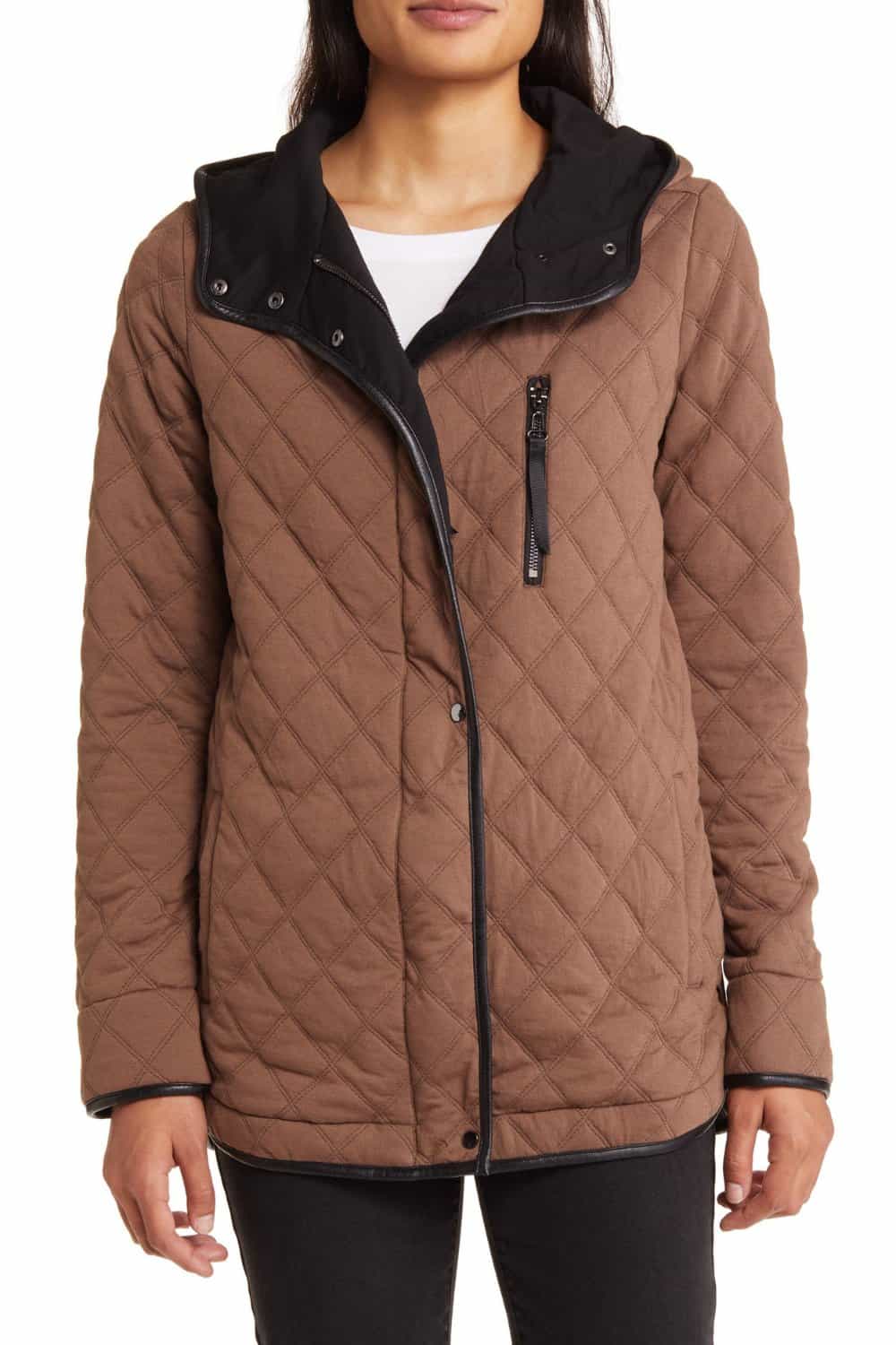 This jacket is more on the heavier side of our best quilted jackets for women that are lightweight. For those who live up north, it can go from 75 and sunny to single digits the next day. This would be considered a ‘lightweight’ jacket, right? This oversized jacket has been given a polished look with diamond quilting and comes with a spacious hood. Additionally, it has a ponte lining to provide extra warmth. The jacket is 29 1/2 inches in length and lined for added comfort.