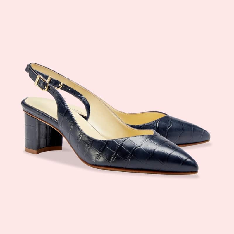 Grab the Emma slingback pumps low heel in navy croc embossed nappa, cognac calf, and black calf.