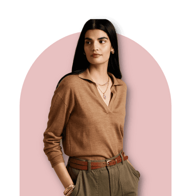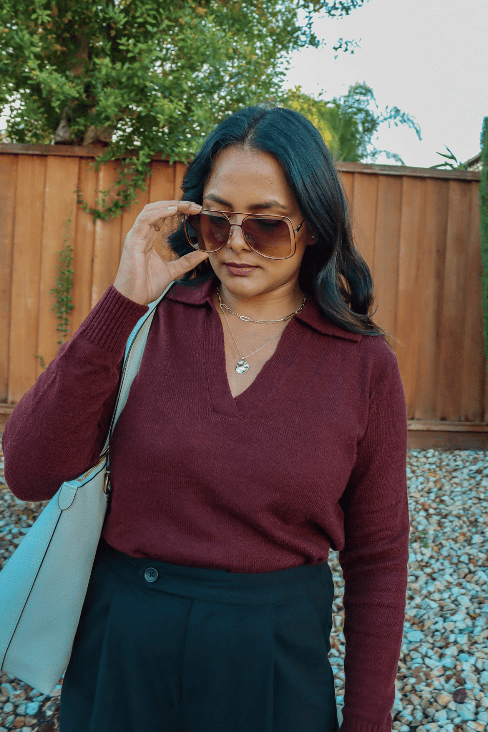 I find the polo collar V neck sweater a really versatile style that will look great on you whether you are running errands or attending a zoom meeting or heading to work. Pair it with some layering necklace that will enhance the V neck even further.