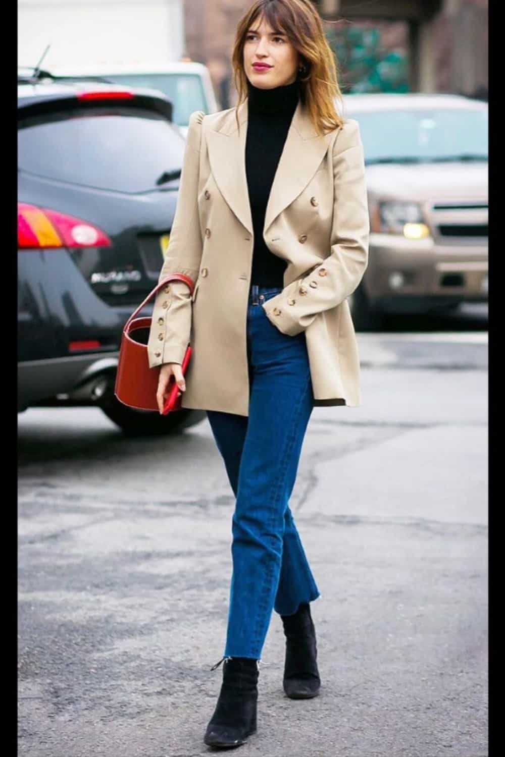 You can never go wrong with basics. And this outfit proves that. The Blue jeans and black turtleneck look is classy. The turtleneck makes the casual jeans look polished. Pair it with a neutral blazer and see how your outfit looks structured and sophisticated.