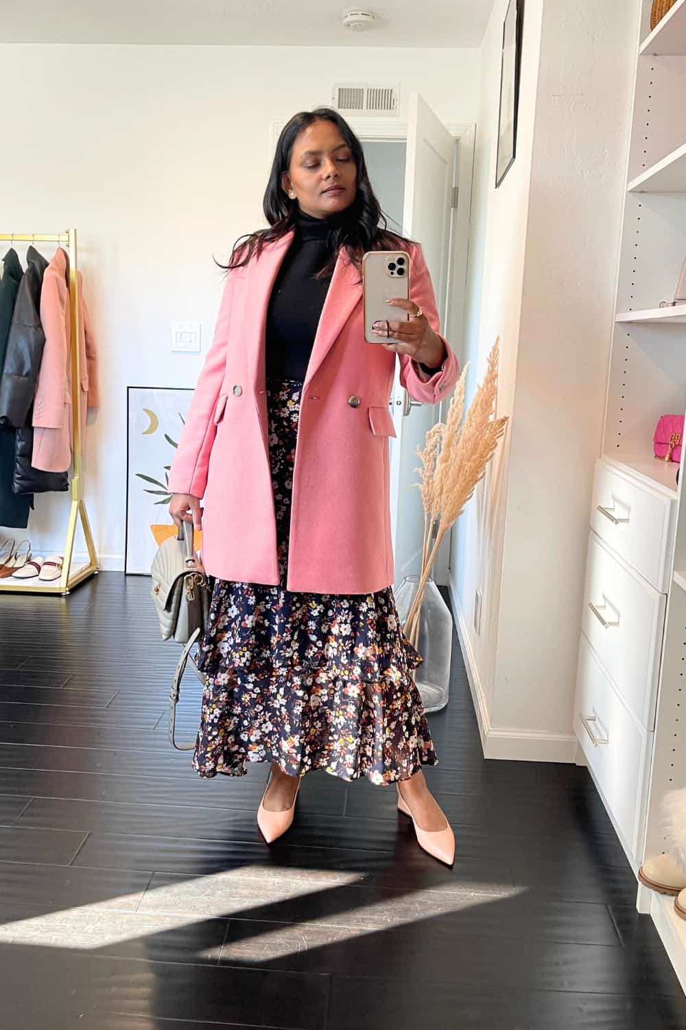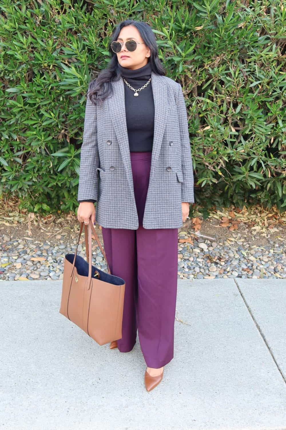 And swap your shoes as the weather gets cooler. I love this outfit. The wide leg jeans elongate your legs and balance the fit of the black turtleneck outfit. And the oversized patterned blazer adds an interesting touch to the outfit.