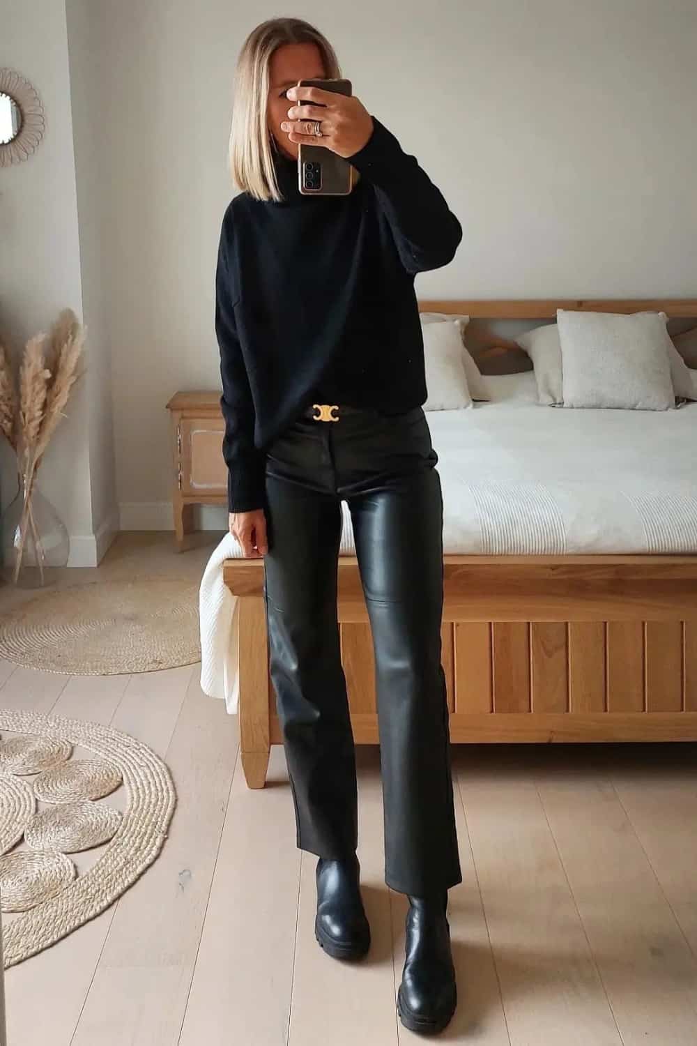 For subtle and chic edginess, create a black turtleneck sweater outfit that incorporates faux leather straight-legs and chunky Chelsea boots. Tie the look together with a gold hardware statement buckle belt.