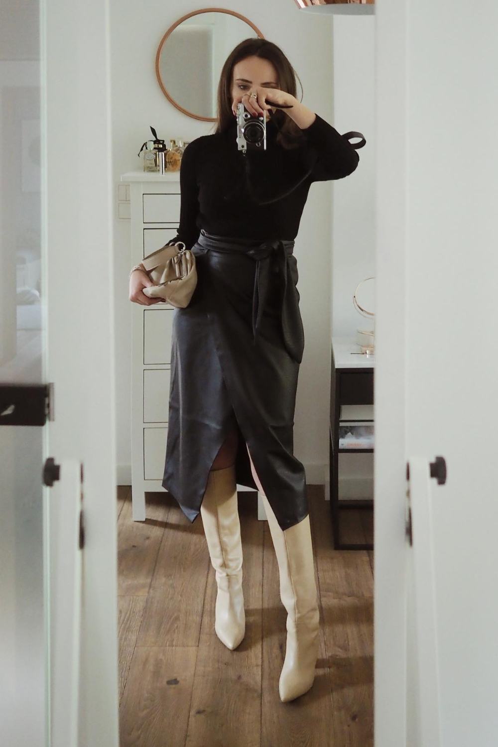 Leather Skirt + Knee High Boots + Shoulder Bag