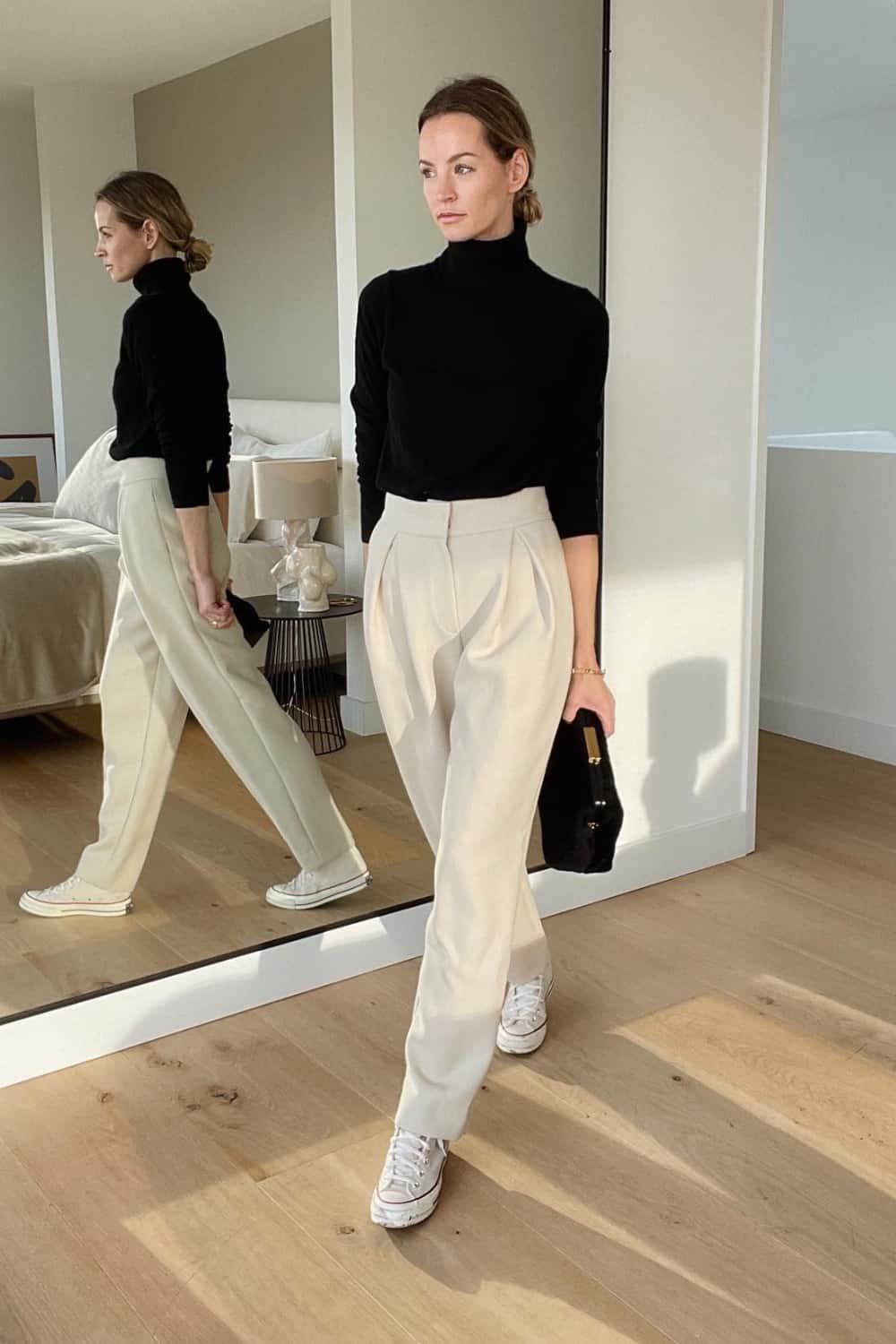 Remix your black turtleneck’s timeless appeal with a tailored wool coat, loose-fitting pants and classic sneakers.