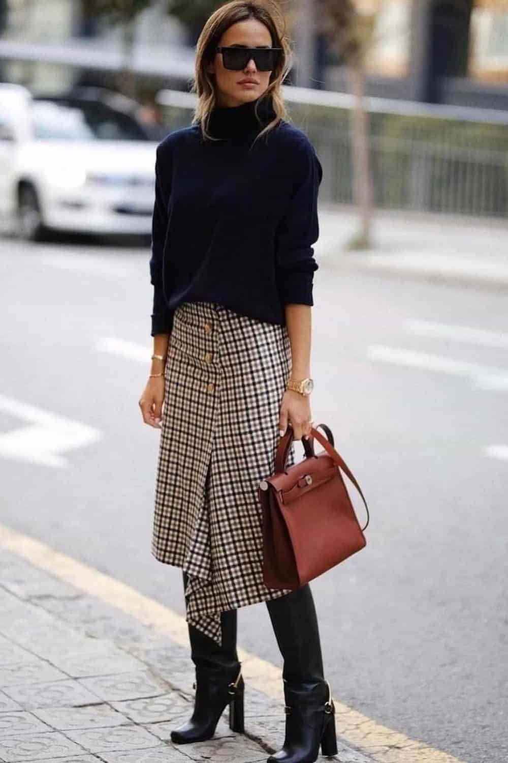 For those who prefer a “quiet luxury” black turtleneck sweater look, this one’s for you. A midi wrap skirt and a pair of leather knee-highs will upgrade your sweater into classy territory.