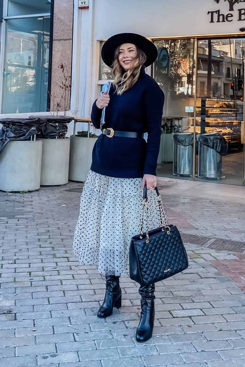 Dress your turtleneck down in a fun, flirty way with a felt fedora hat and dotted midi skirt. Perfect this aesthetic with leather knee-highs and a quilted leather tote.