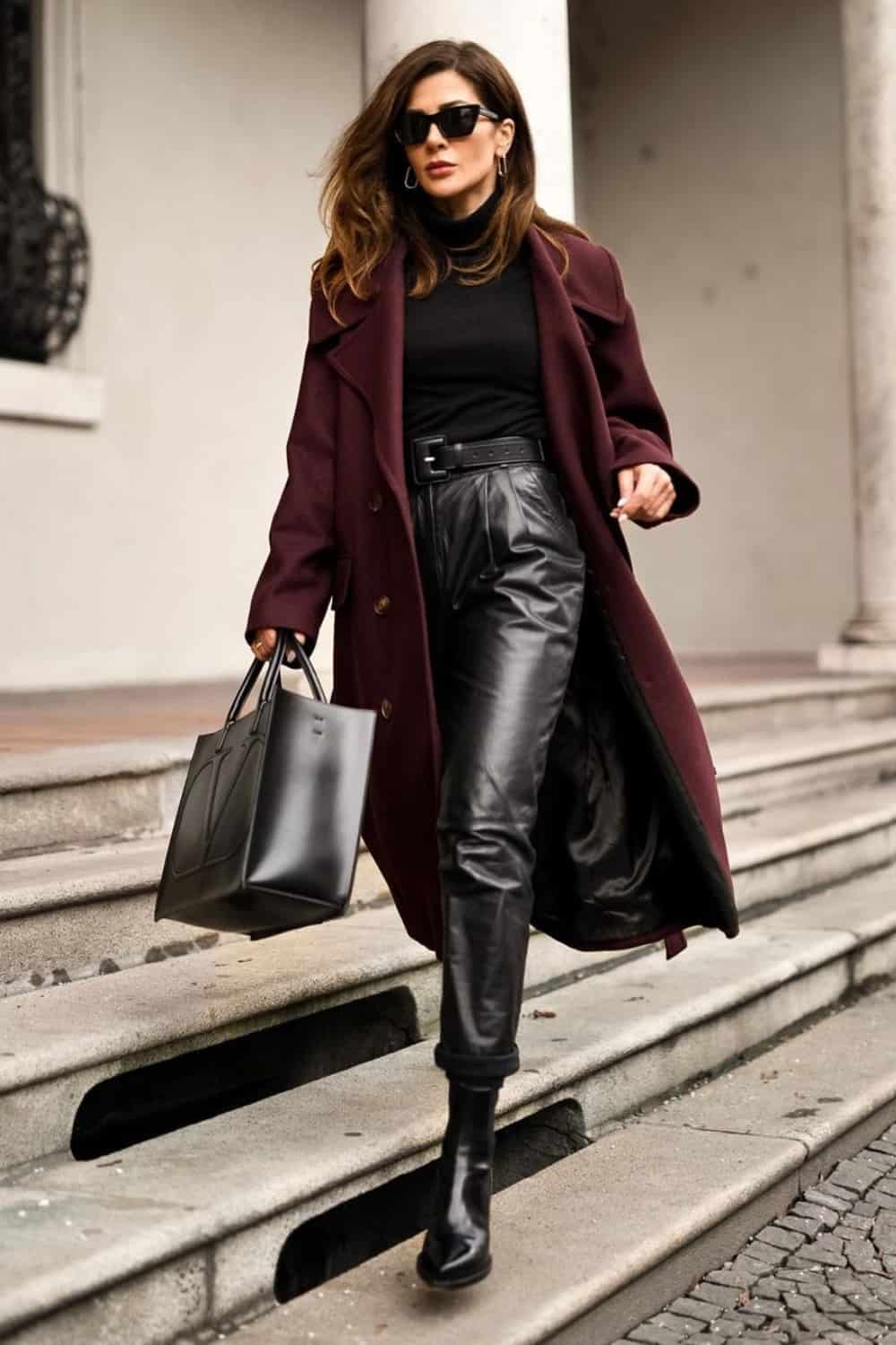Leather Pants + Ankle Boots + Burgundy Coat