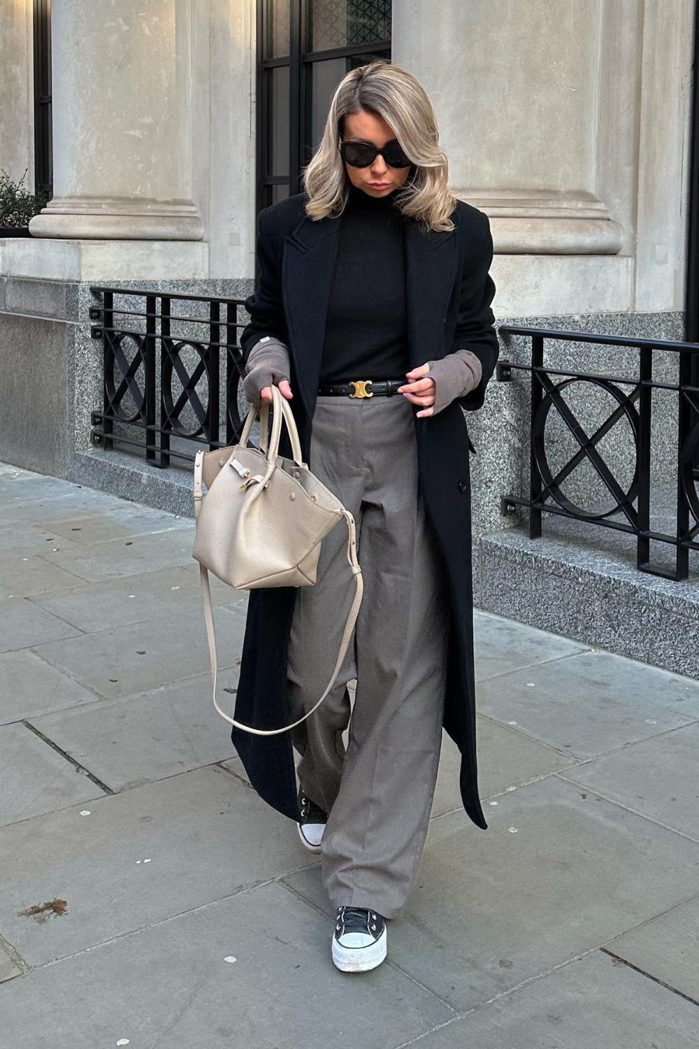 [Gray Pants] [Black Wool Coat] [Tote Bag] [Converse] [Black Belt]