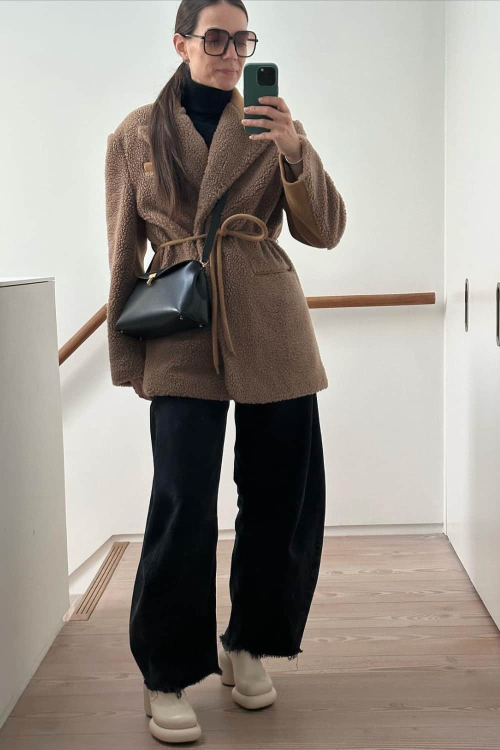 A black turtleneck sweater bundled up in a teddy coat and paired with subtly flared jeans can become a go-to look for days when you need cozy vibes and extra warmth.