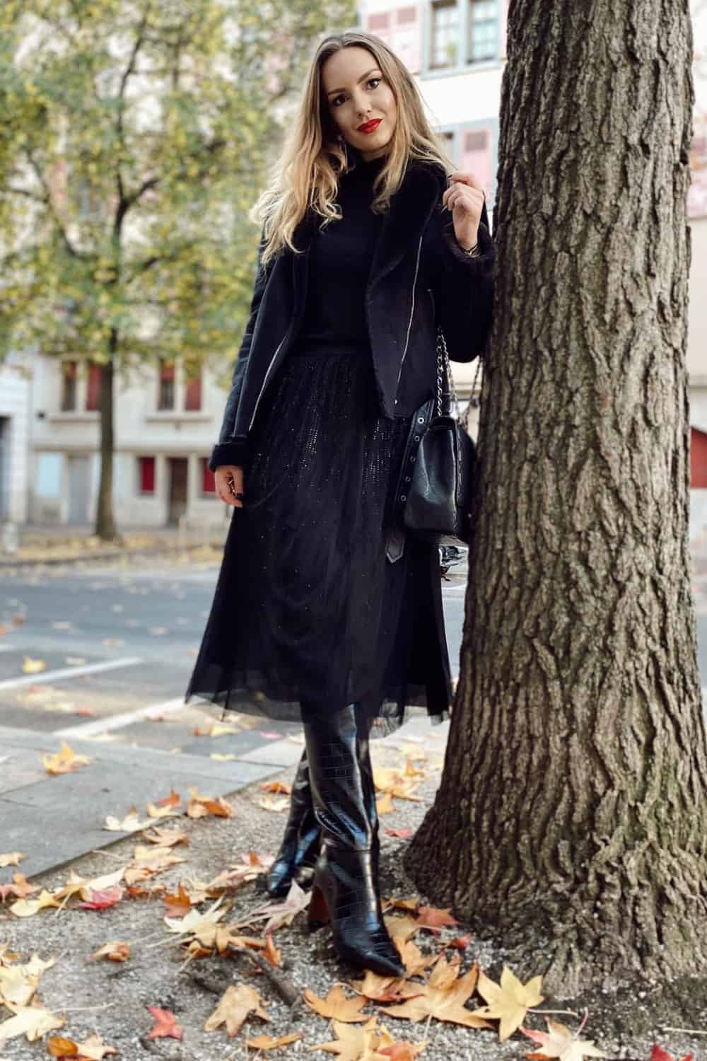 Reinvent your black turtleneck with a glittery tulle midi skirt, a shearling trim leather jacket and some patent leather knee-highs for a romantic aesthetic. Add elegant statement earrings and a quilted chain strap bag to upgrade this look.