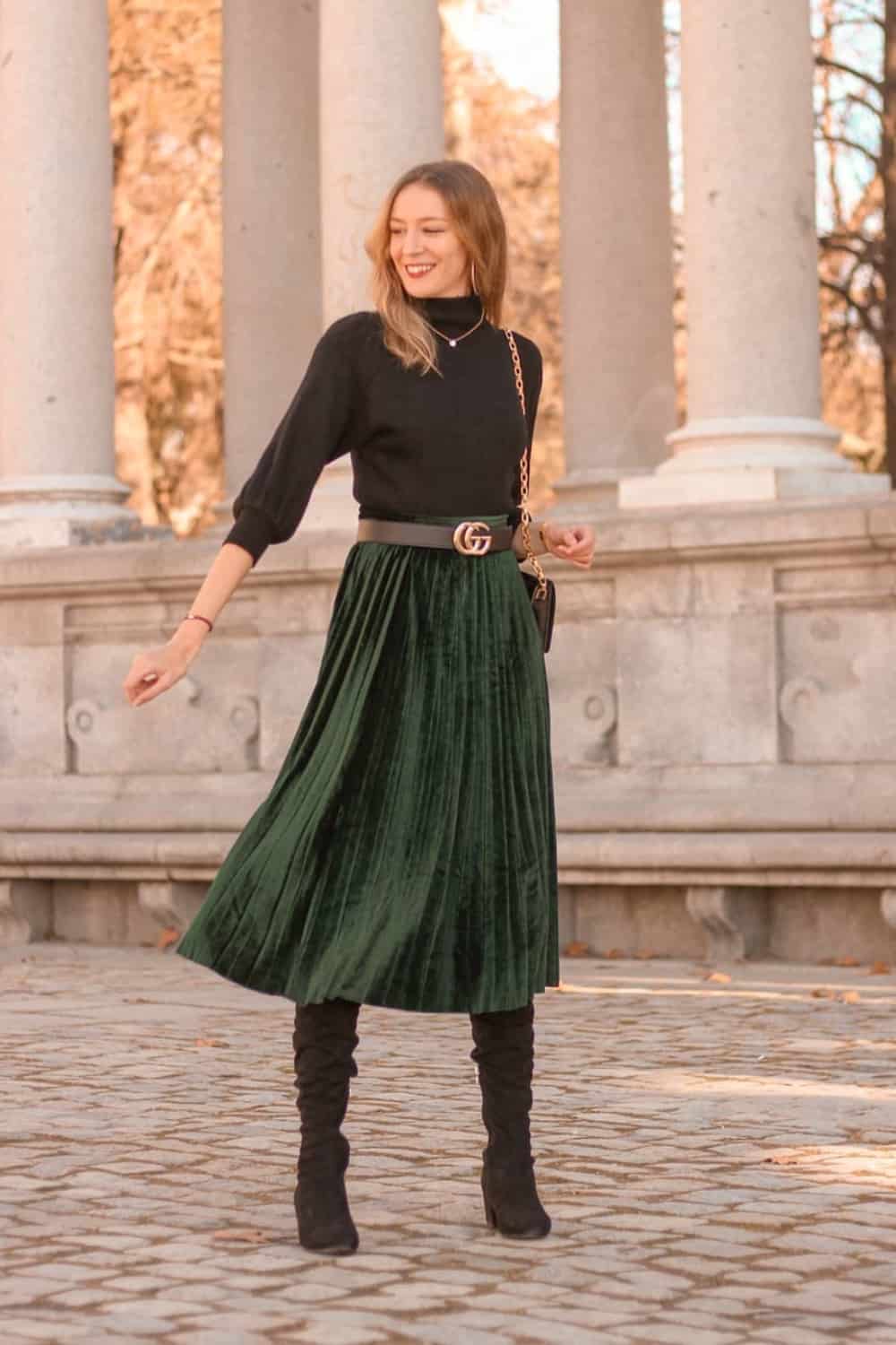 Accentuate the classic aesthetic of the black turtleneck by pairing it with a pleated velvet midi skirt and thigh-high boots. Cinch the outfit with a chic designer belt.