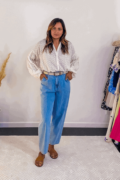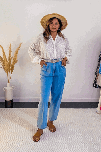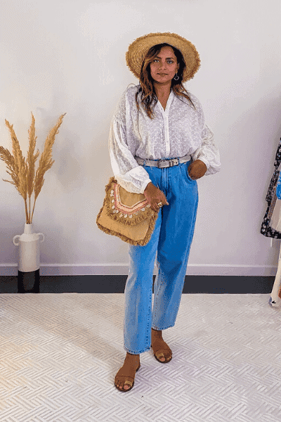 Add a bohemian top which looks more flowy. This top from Free People has eyelet embroidery that is a perfect boho vibe and the puff sleeves add to the drama. The shirt style gives a modern style of bohemian look to the outfit.