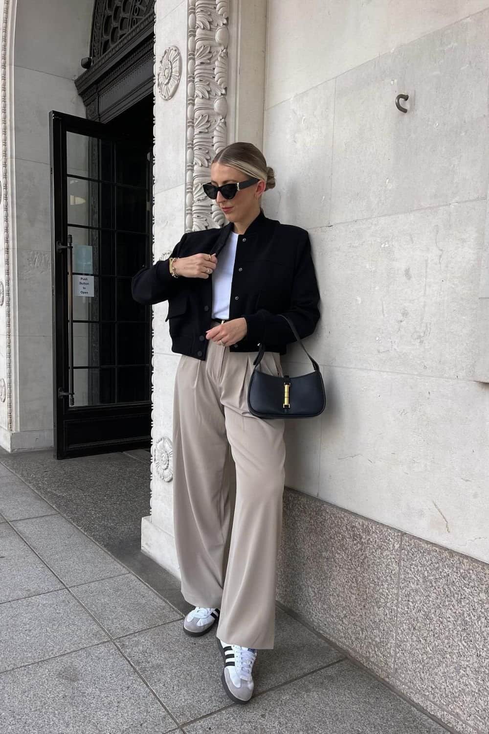 The classic black bomber jacket takes center stage, but not as you know it. Its reinvention lies in a sleek, buttoned front, which moves away from the conventional zip and infuses the jacket with a more polished look. It’s a cohesive outfit.