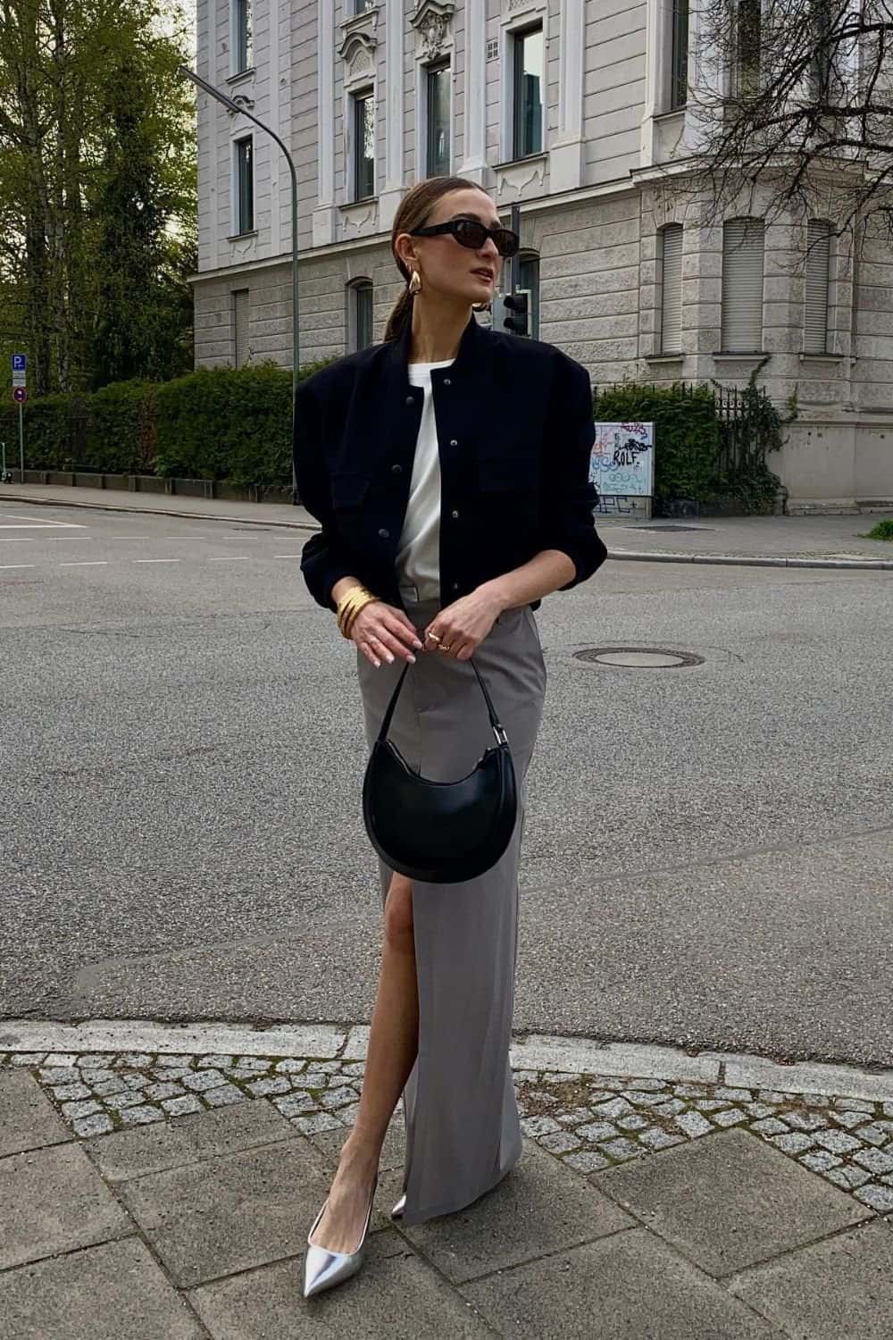 This ensemble is a masterclass in styling a bomber jacket for a look that’s both effortless and polished. The key? A well-tailored, oversized bomber jacket in a muted light gray, a prime example of understated elegance.