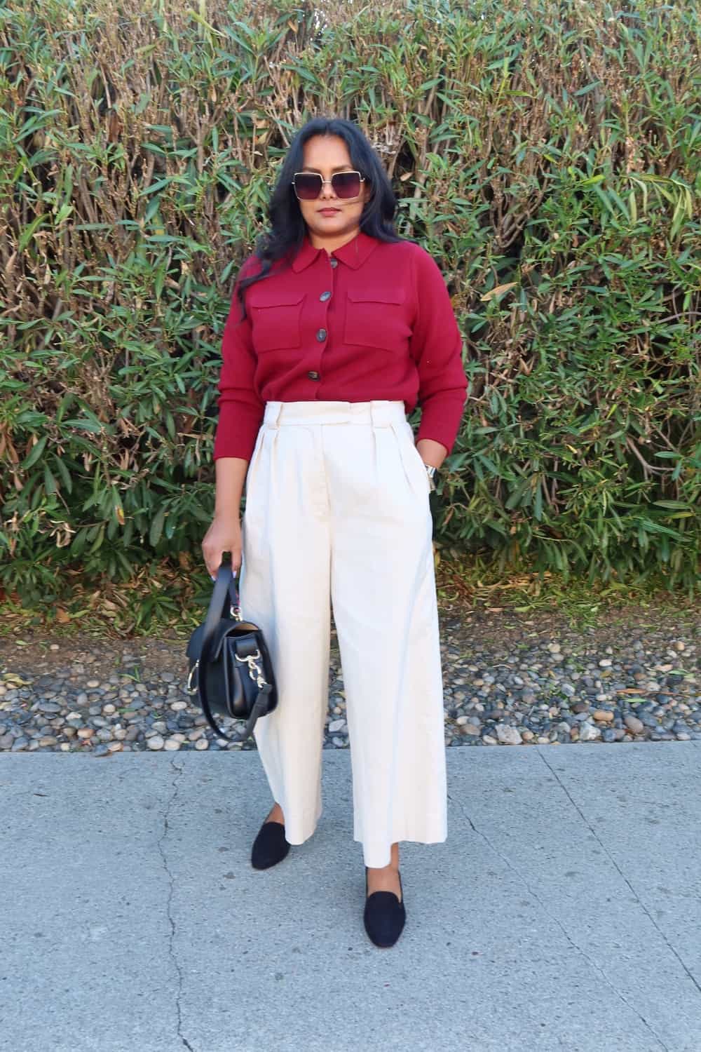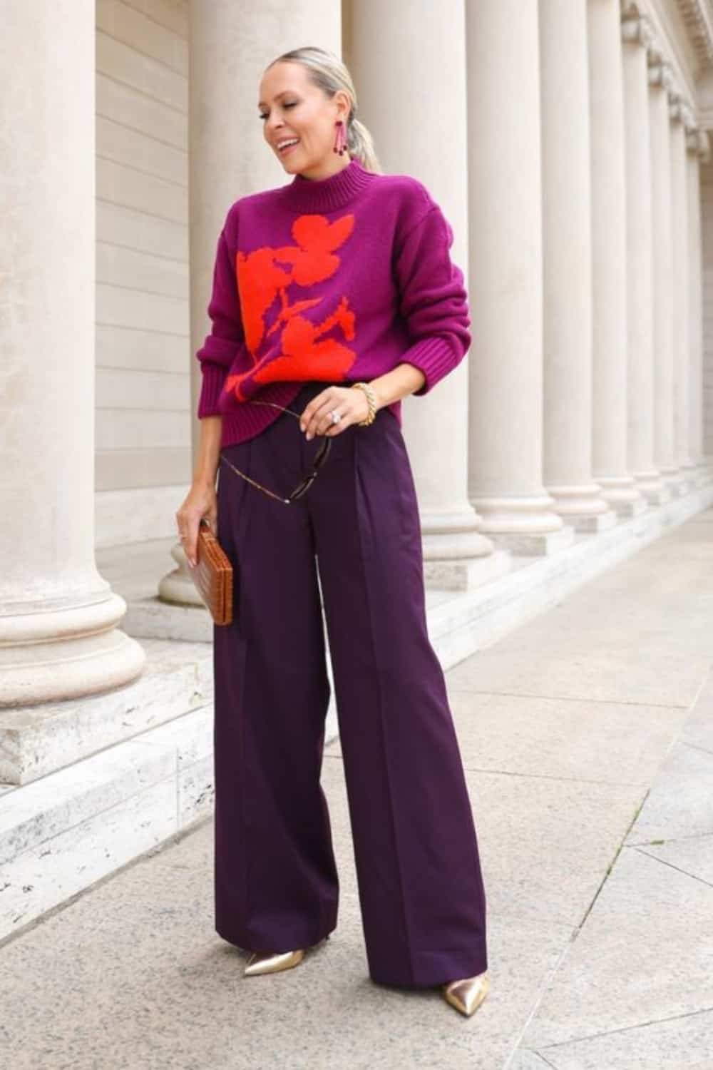 Trousers always look classy no matter what you pair them with. In this outfit the casual printed sweater looks much better paired with the wide leg pants. And because the color of the sweater is similar to the trouser, the outfit looks luxe and sophisticated.