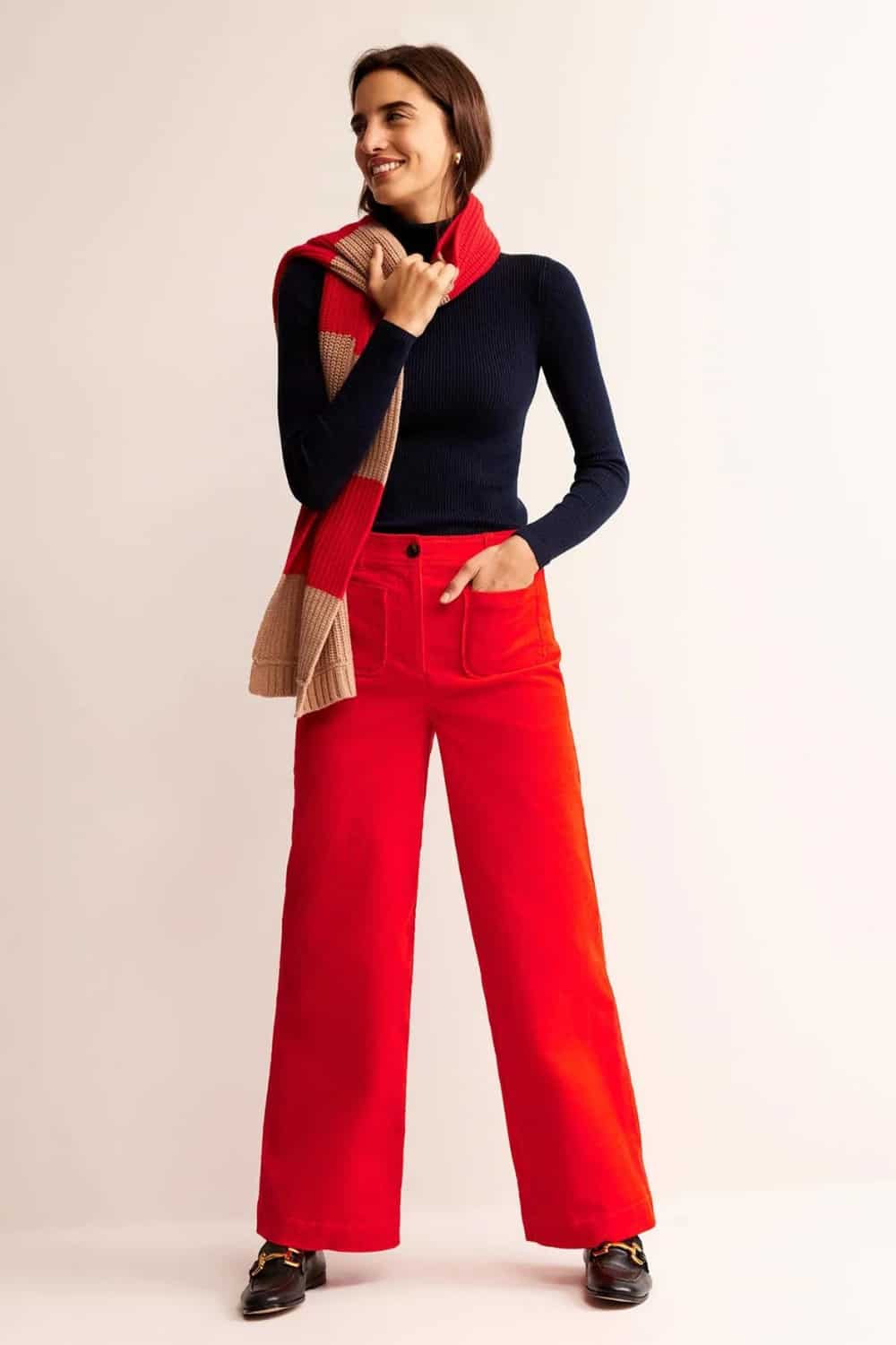 Pair the turtleneck sweater with colored corduroy pants and you have a fun yet classy outfit. And corduroy pants are also much more comfortable and give you a casual vibe.