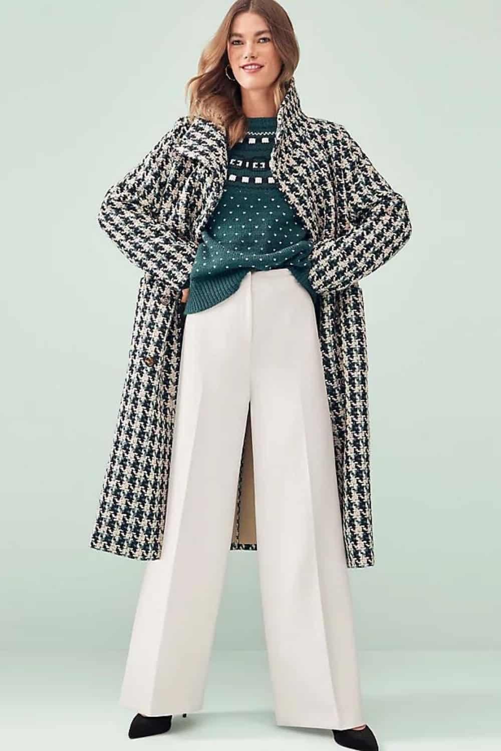 Add cute heels or you can also pick boots. And layer with your favorite patterned coat for a sophisticated and cozy thanksgiving dinner outfit. You can wear this outfit for dinner parties at a restaurant, Friendsgiving and also to family thanksgiving dinners.
