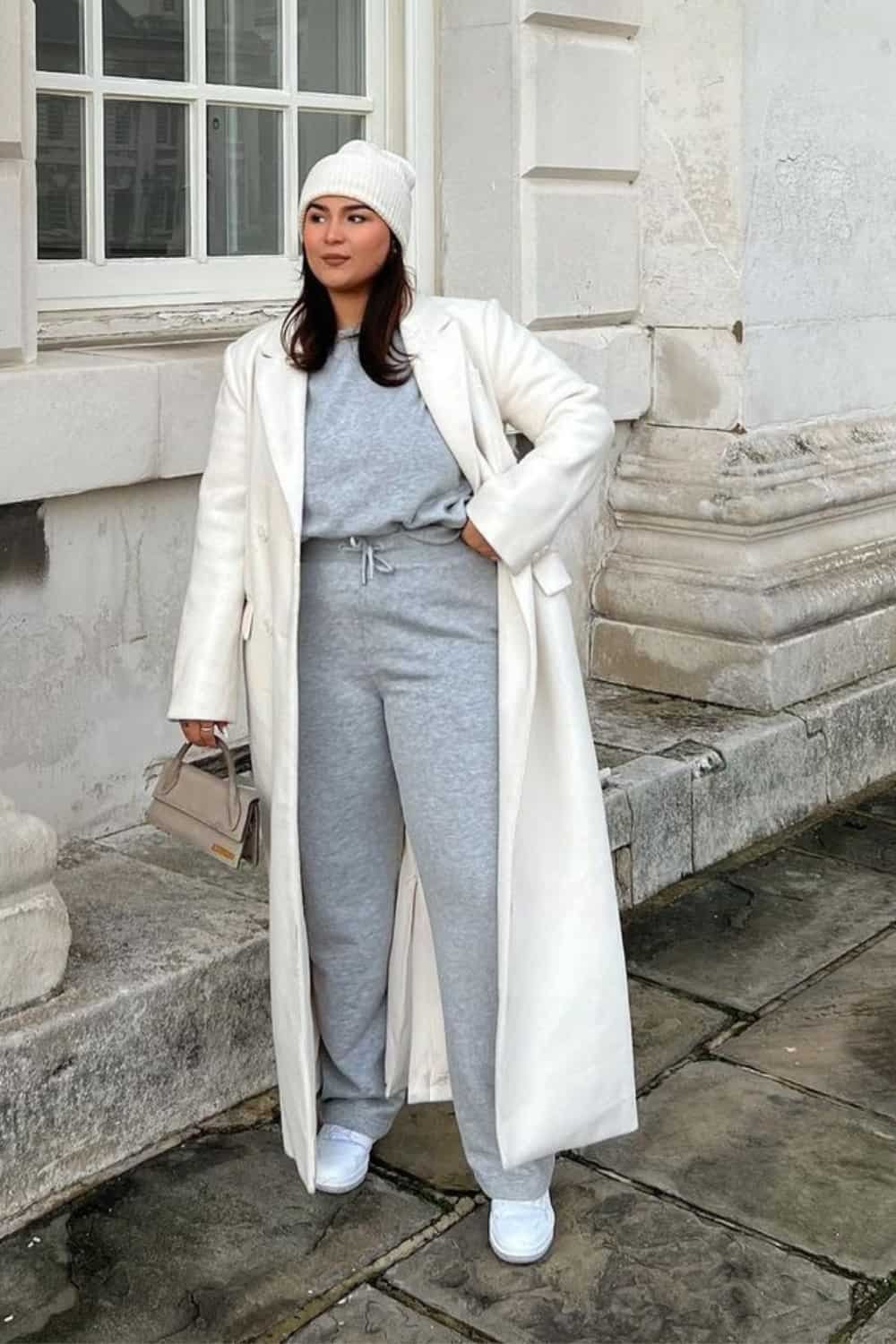 Want a really comfortable outfit to wear to your family thanksgiving dinner that looks classy too. Try this outfit with a matching wide leg joggers with sweatshirt. And add a white wool coat that will instantly turn this casual look sophisticated and classy.