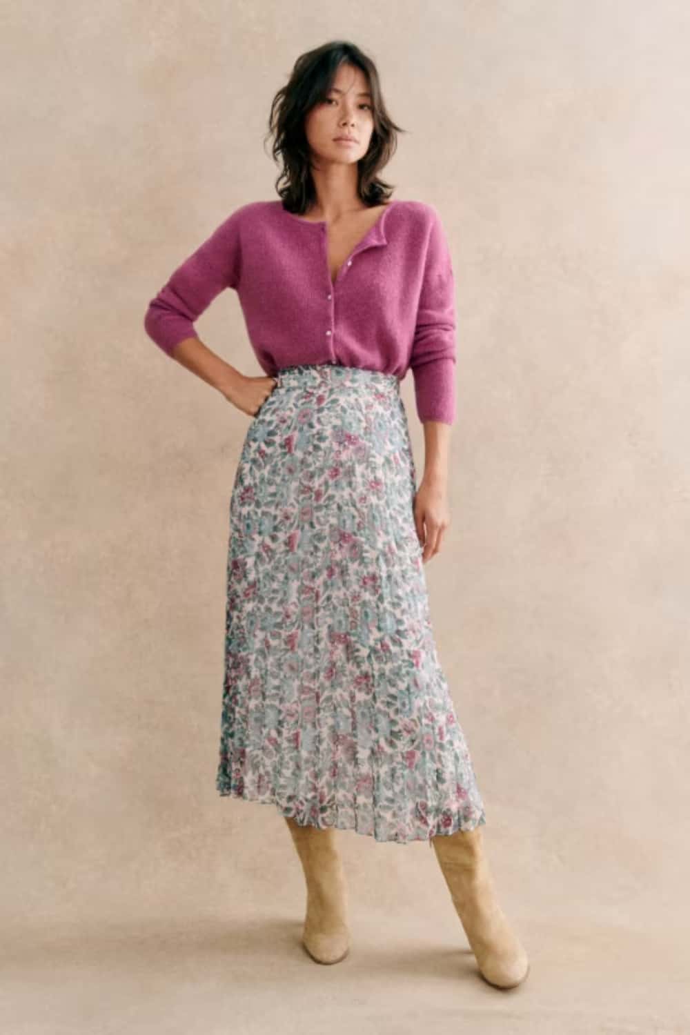 This cardigan and printed skirt outfit can be replicated in so many outfit formulas. Simply pick a midi length printed skirt. And add a contrasting colored cardigan as a top.