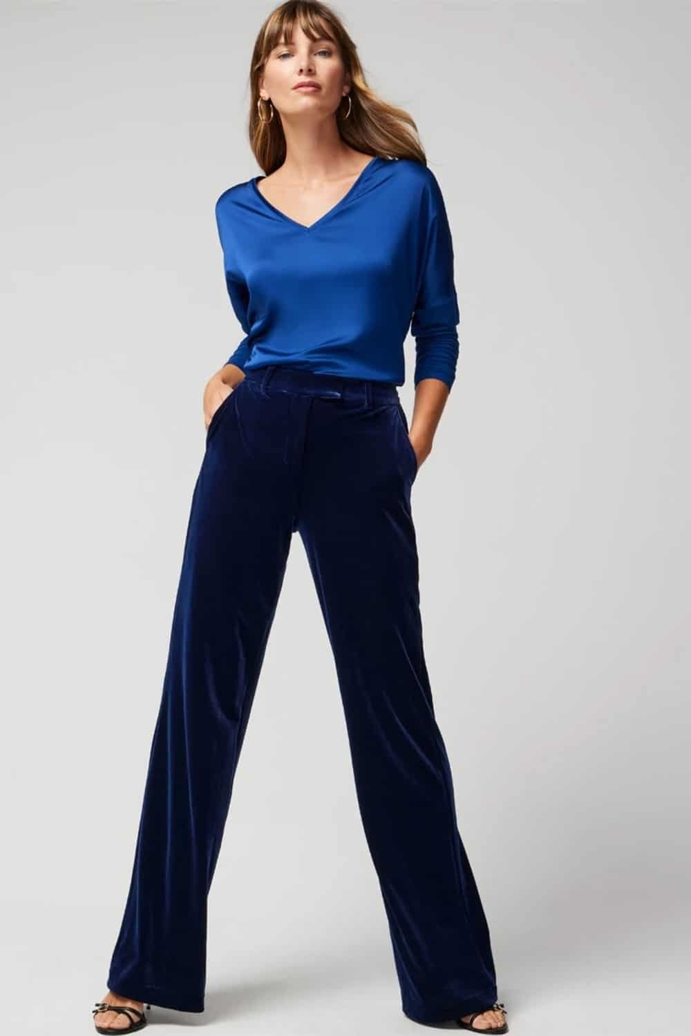 Velvet pants will keep you cozy and they look chic too. The only tip here is to pick a non conventional color like navy or purple instead of traditional Christmas shades. This makes them look modern and elevated.