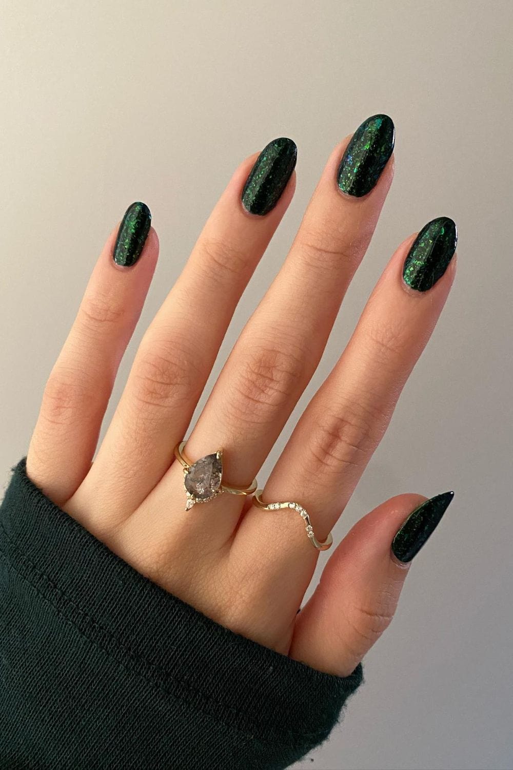 Are you the one that eagerly awaits the Halloween decor and holiday season? This unique shimmery green is a look you will especially be drawn to. The choice of green shown here isn’t too loud compared to other shades, which typically give it more of a “cheesy” appearance. However, this look gives a statement appropriately and is aligned with the trendy deep green that is in season for Fall 2024. OPI GelColor in Midnight Snacc is a perfect choice to mimic this color shade. Then add a glitter polish of your choosing to layer on top, I suggest DND’s Hologra-Fun.