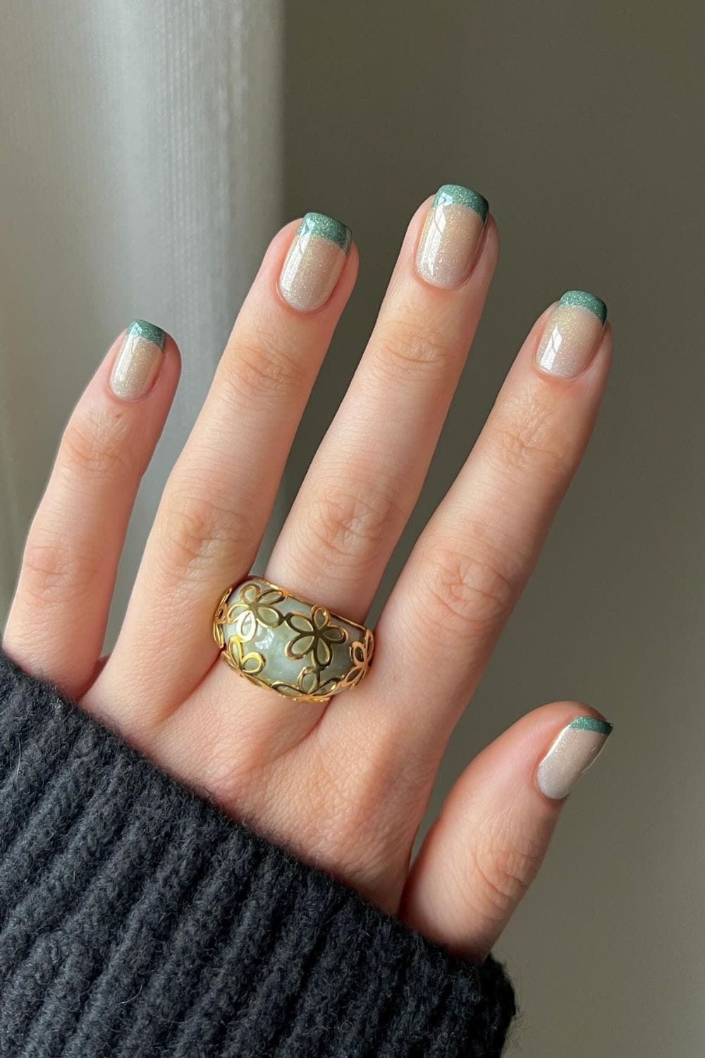 Another playful yet elegant way to sport green this Fall is by choosing a teal French design. It’s easy to fall into the red and brown manicure trends but this is an innovative manicure to incorporate more cool tones. We often forget that colors such as denim blues, emerald, and jade greens are also part of an autumnal palette. What makes this French design unique is its addition of a coat of a light shimmer polish. This Jelly Gel Nail Polish is great to recreate that soft, iridescent shimmer.