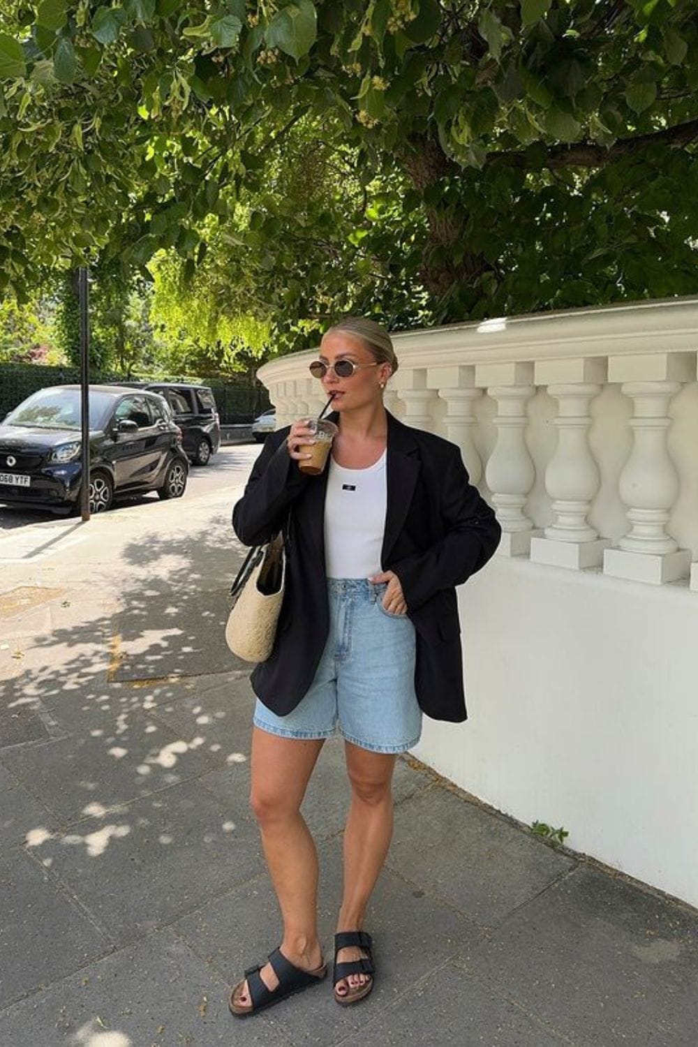 [Black Blazer] [Denim Shorts] [Sandals]