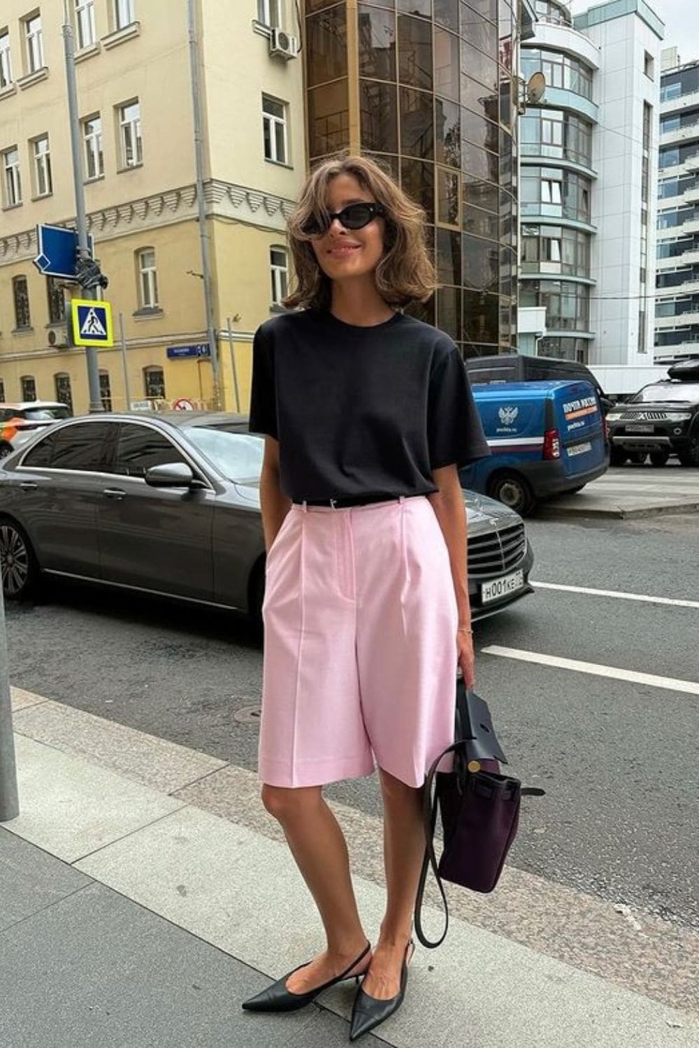A short outfit that sums up both comfort and elegance make it one of the best outfits to wear in the summer. This piece is not just a pair of shorts but a piece of clothing with a pink colour that so vividly contrasts with the general grey and black clothing items.