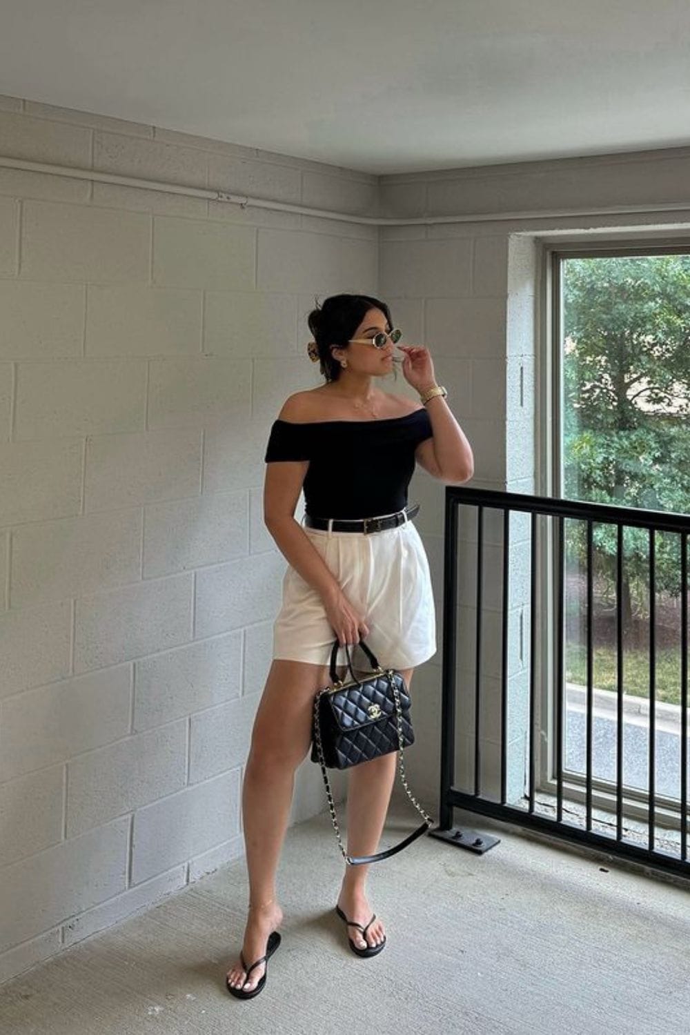 A masterclass in styling simplicity that takes your summer look to a new level of sophistication. This outfit blends a sleek, off-shoulder black top with crisp white shorts, creating a striking contrast that’s as eye-catching as it is elegant.