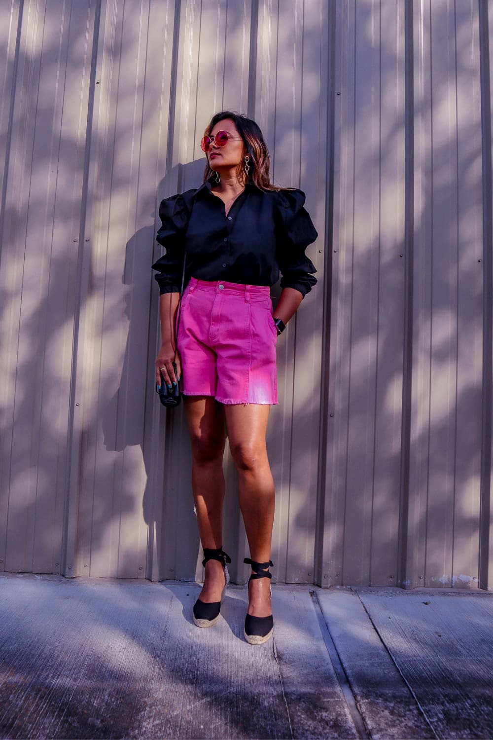 The pink-fitting shorts are refreshing for summer with a touch of classy and elegant look, while the black top is classy and blends well to complement the outfit. The material used in the shorts is quite comfortable, and you are not stuck sweating in them while walking from store to store in the city or having a leisurely brunch on a Sunday.