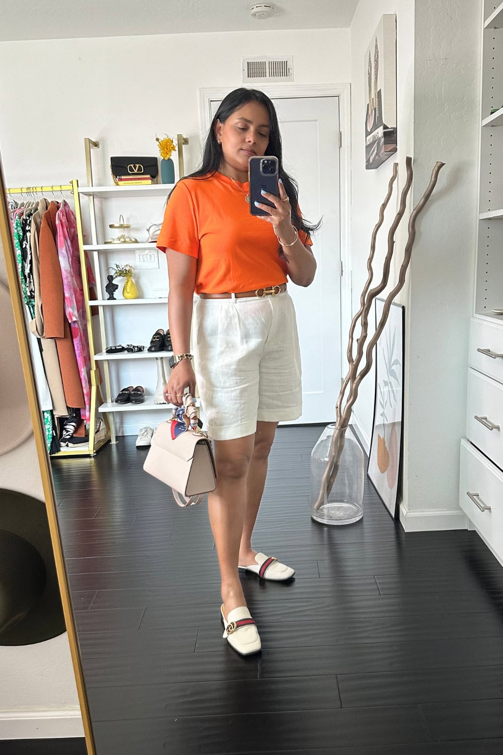 [White Shorts] [Shirt] [Leather Belt] [Sandals] [Straw Bag]