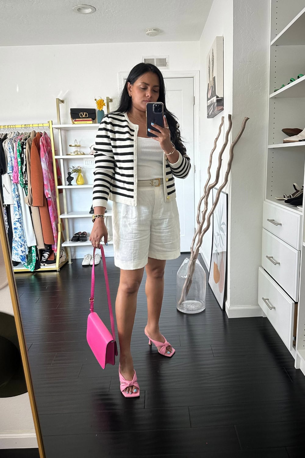 The white shorts are a universal staple, easy to dress up or down depending on the occasion. When matched with the timeless elegance of a striped cardigan, the look transcends basic summer wear, offering a polished yet relaxed vibe. It’s perfect when you want to look effortlessly put together.