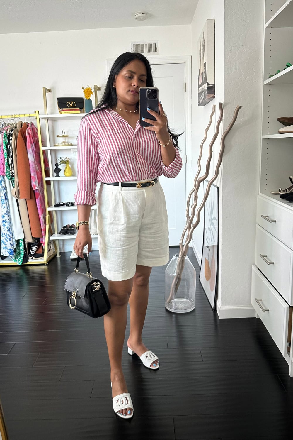 The white shorts serve as a blank canvas, allowing the bold stripes of the shirt to sing without overpowering. The mix of the structured shirt with the relaxed fit of the shorts strikes a perfect balance, making this outfit ideal for a variety of settings, from a busy day at the office to a relaxed weekend brunch.