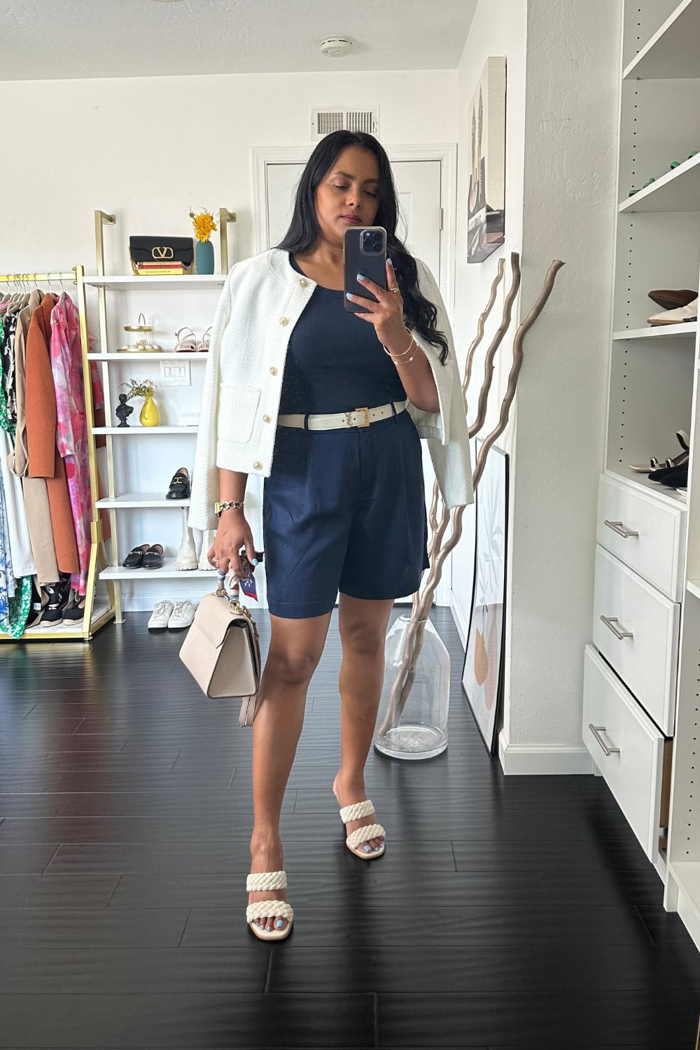 This look features a deep navy short, perfectly paired with a lightweight, ivory tweed jacket, creating a juxtaposition of casual and chic that screams summer sophistication.