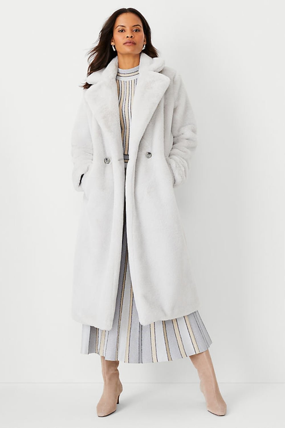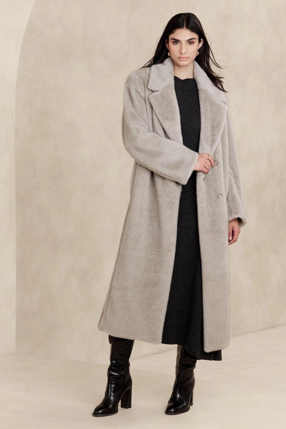 And these faux fur coats come in so many colors and length. Pick a long one that you can wear with all lengths of dresses in confidence.
