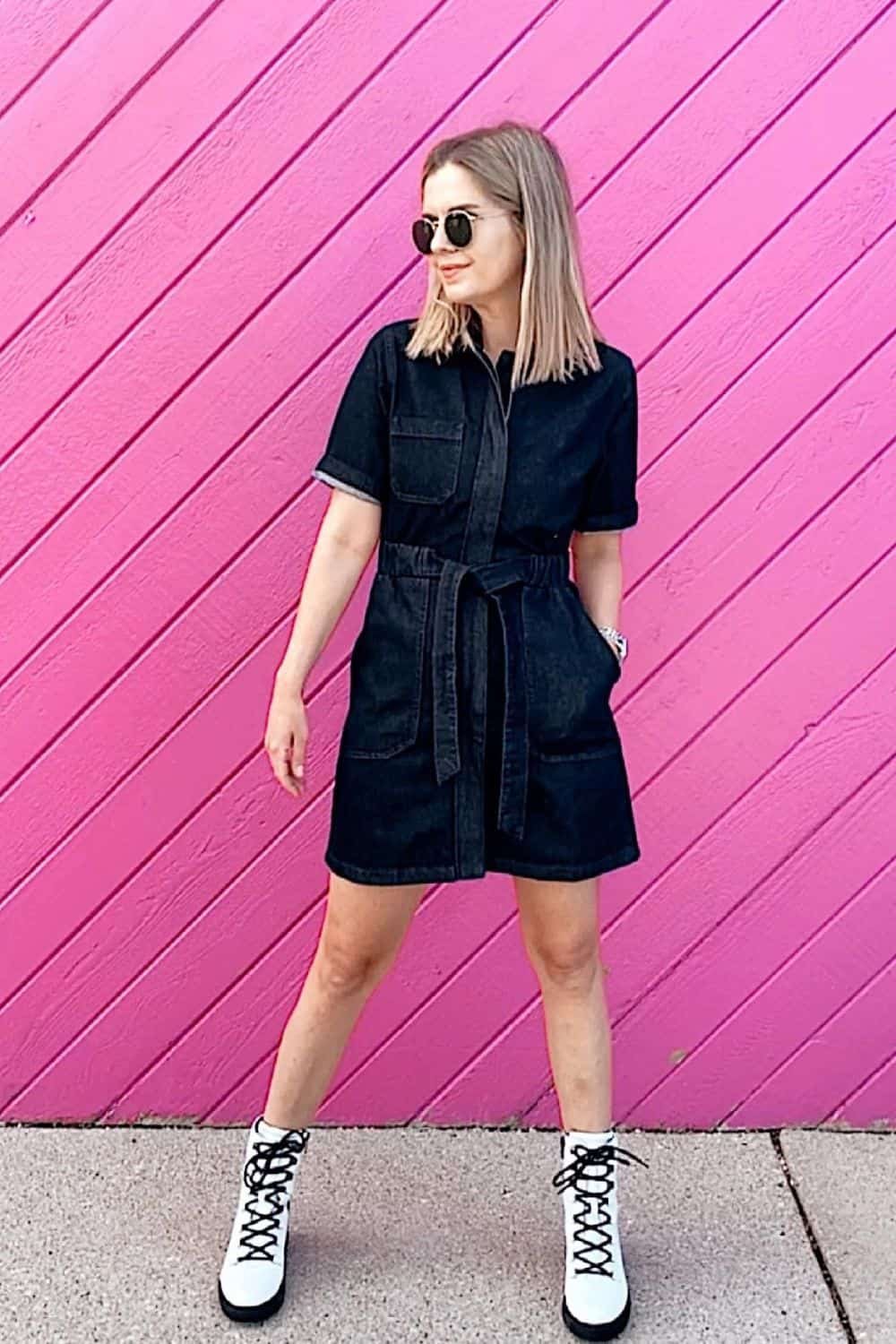 Since it’s cinched at the waist, this ensemble creates a relaxed yet feminine silhouette. Denim has a way of giving off an approachable vibe, while the light-colored combat boots add to the informal and leisurely aesthetic.