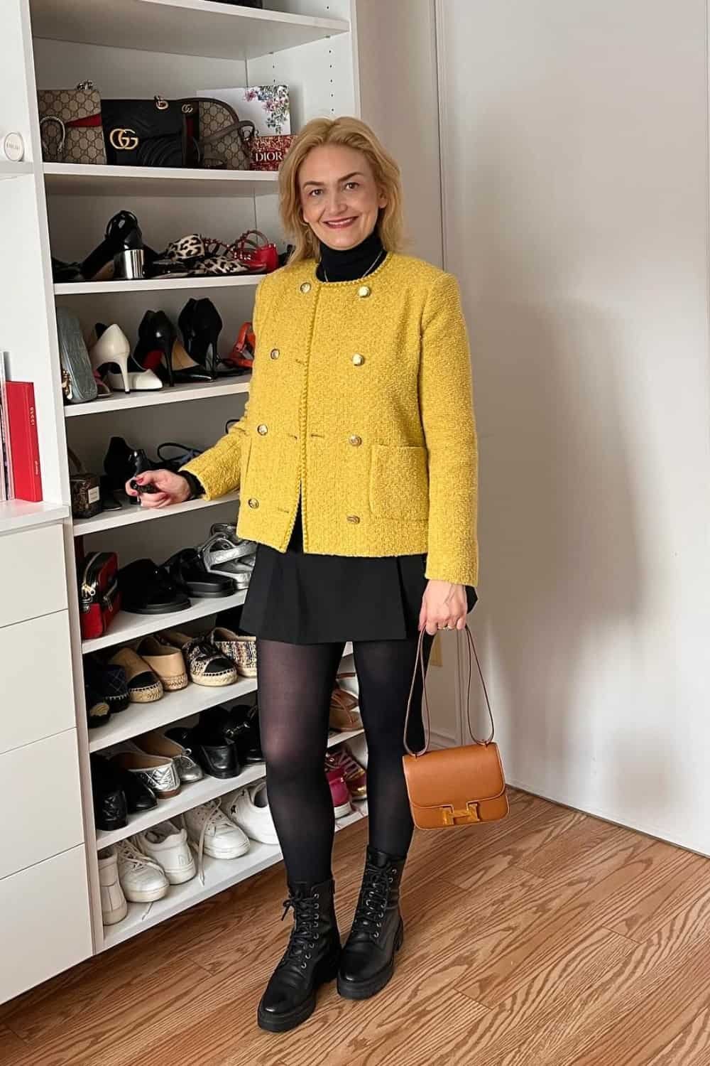 Experiment with your boots by combining them with a simple turtleneck top, an elegant skort and a cropped tweed jacket for an unexpected twist on the basics. You can pair this outfit with sheer black tights, a chain necklace, an elegant ring set and a structured handbag.