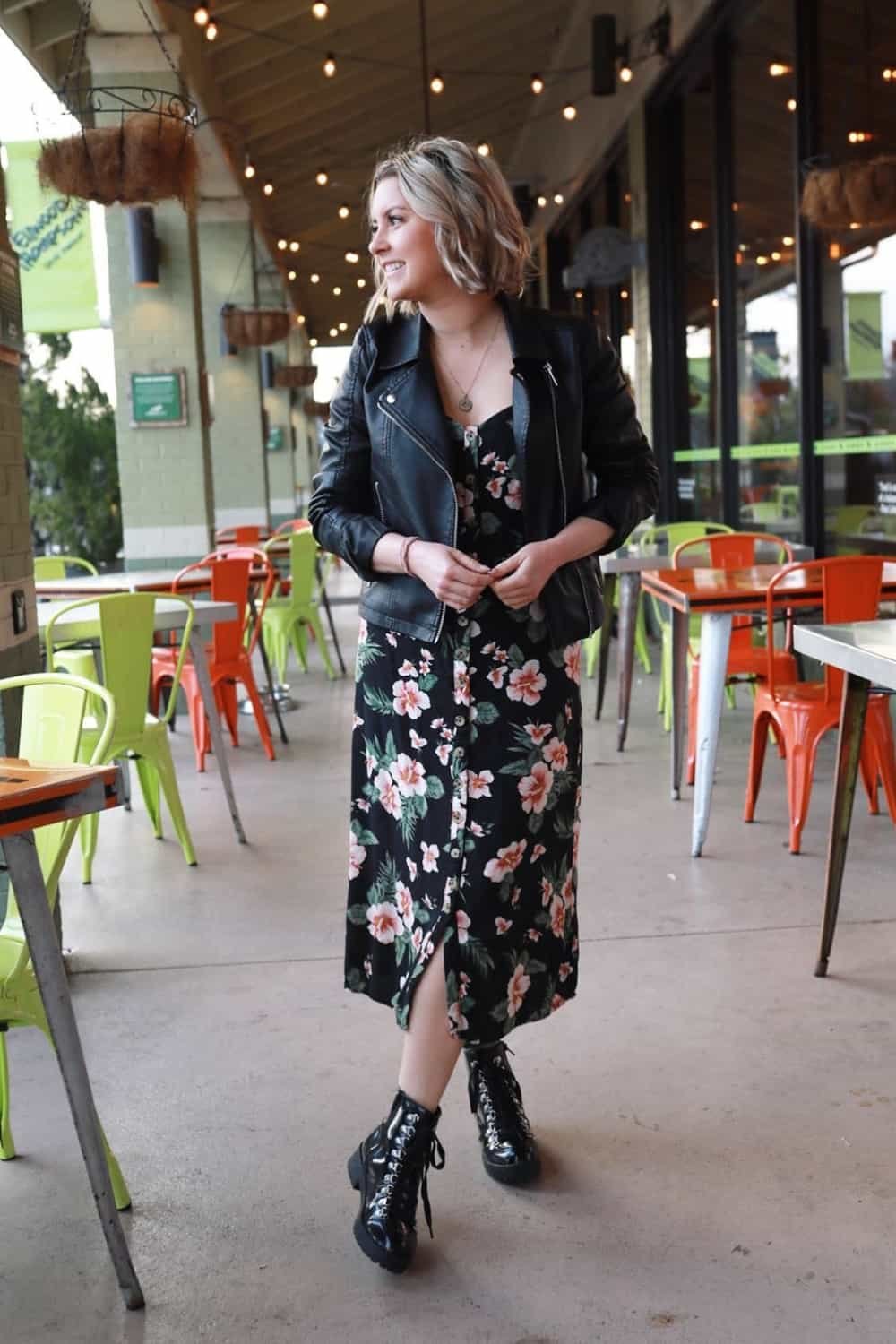 If you’re into floral dresses but wondering how to wear them with combat boots–here’s how. Pair the shoes with a long floral dress and top it off with a faux leather moto jacket.