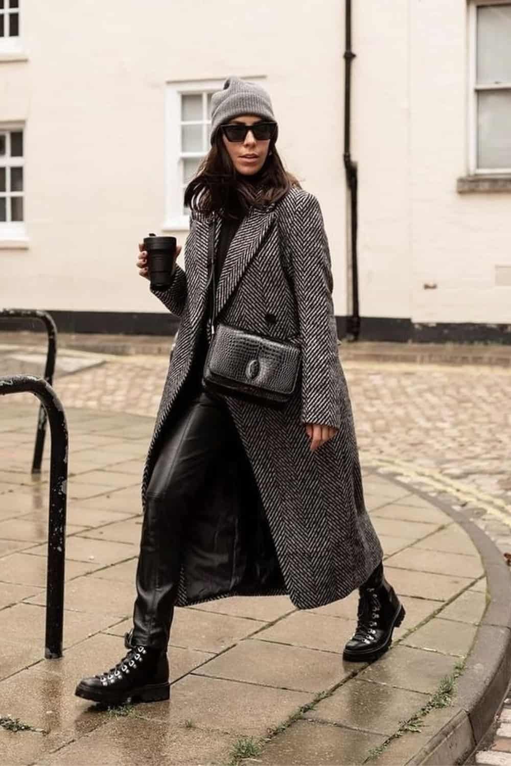 If you have a busy day ahead of you, your combat boots can be worn with an outfit that prioritizes comfort and functionality. Pair them with faux leather pants, a luxurious turtleneck and an oversized wool blend coat.