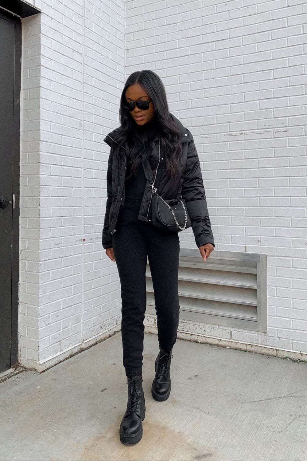 Combat boots are a great way to achieve a chic city style with minimal effort. To pull this off, pair your kicks with a form-fitting sweater, some cropped pants and a short puffer jacket.
