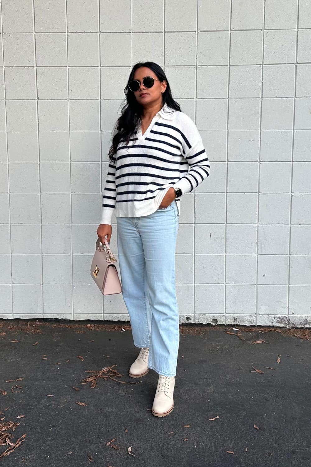 The striped detail always adds more detail to your look compared to a plain colored sweater. And if you have a white combat boot, you can also wear lighter shades of jeans in the cold weather to create a fresh change.
