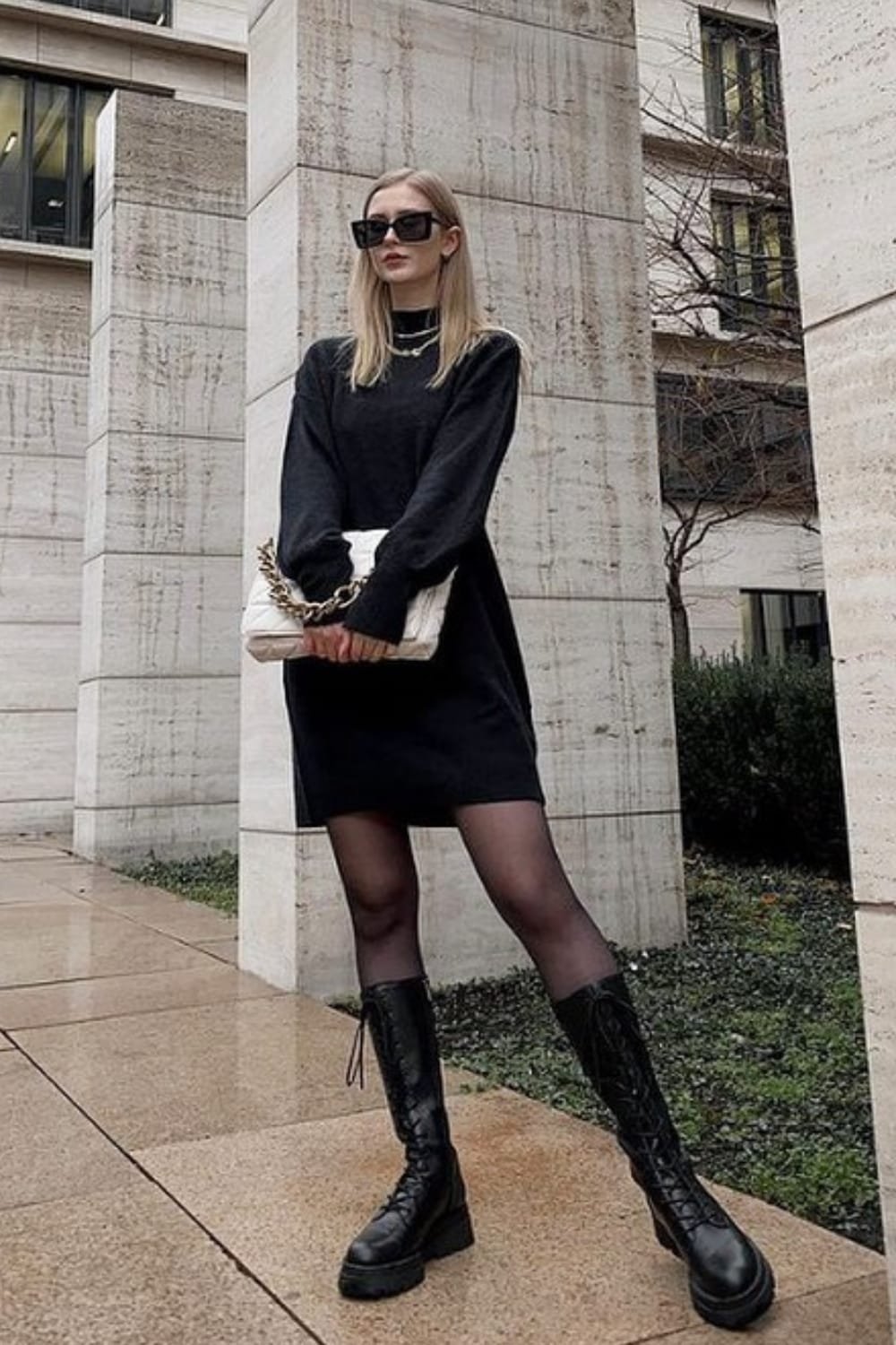 For a refined yet edgy look, pair your combat boots with a classic sweater dress, a few tiered necklaces and a chic construct colored clutch to change up the all black look. Complete the fit with sheer tights and luxe sunglasses.