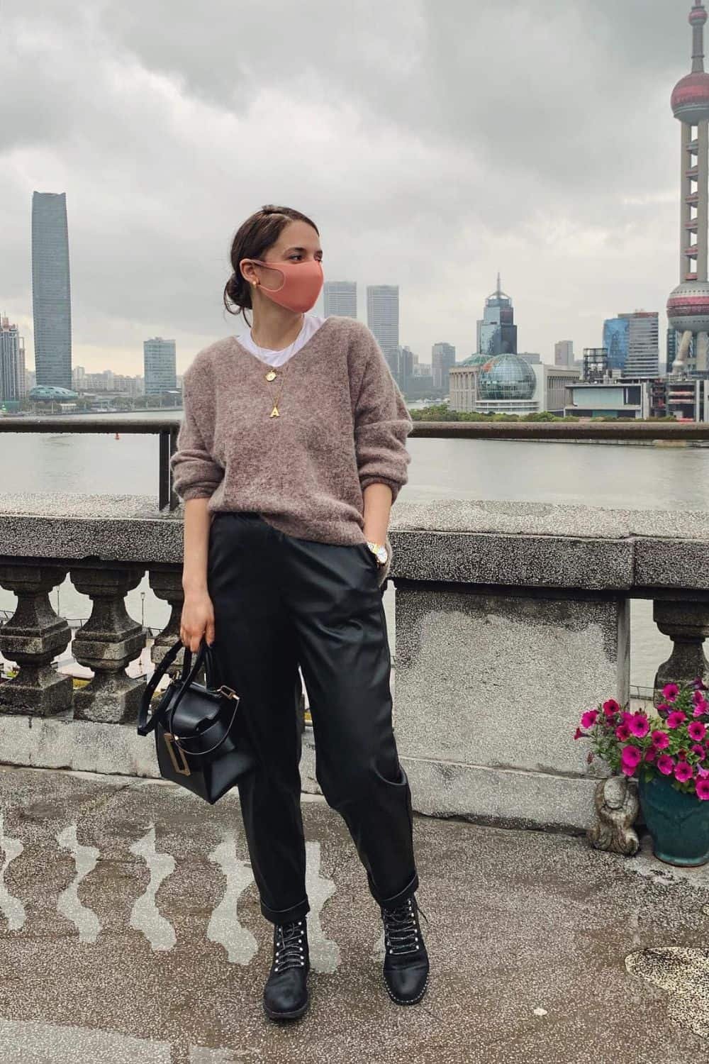 While the boots and leather pants add a touch of toughness, the look is polished to perfection thanks to the elevated sweater and structured coat.