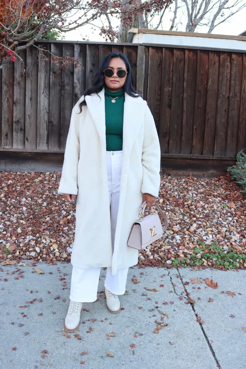Wear a colored turtleneck underneath and keep the rest of the look neutral to look cohesive with white jeans. This outfit is versatile. You can wear it to work, run errands and so many more places.