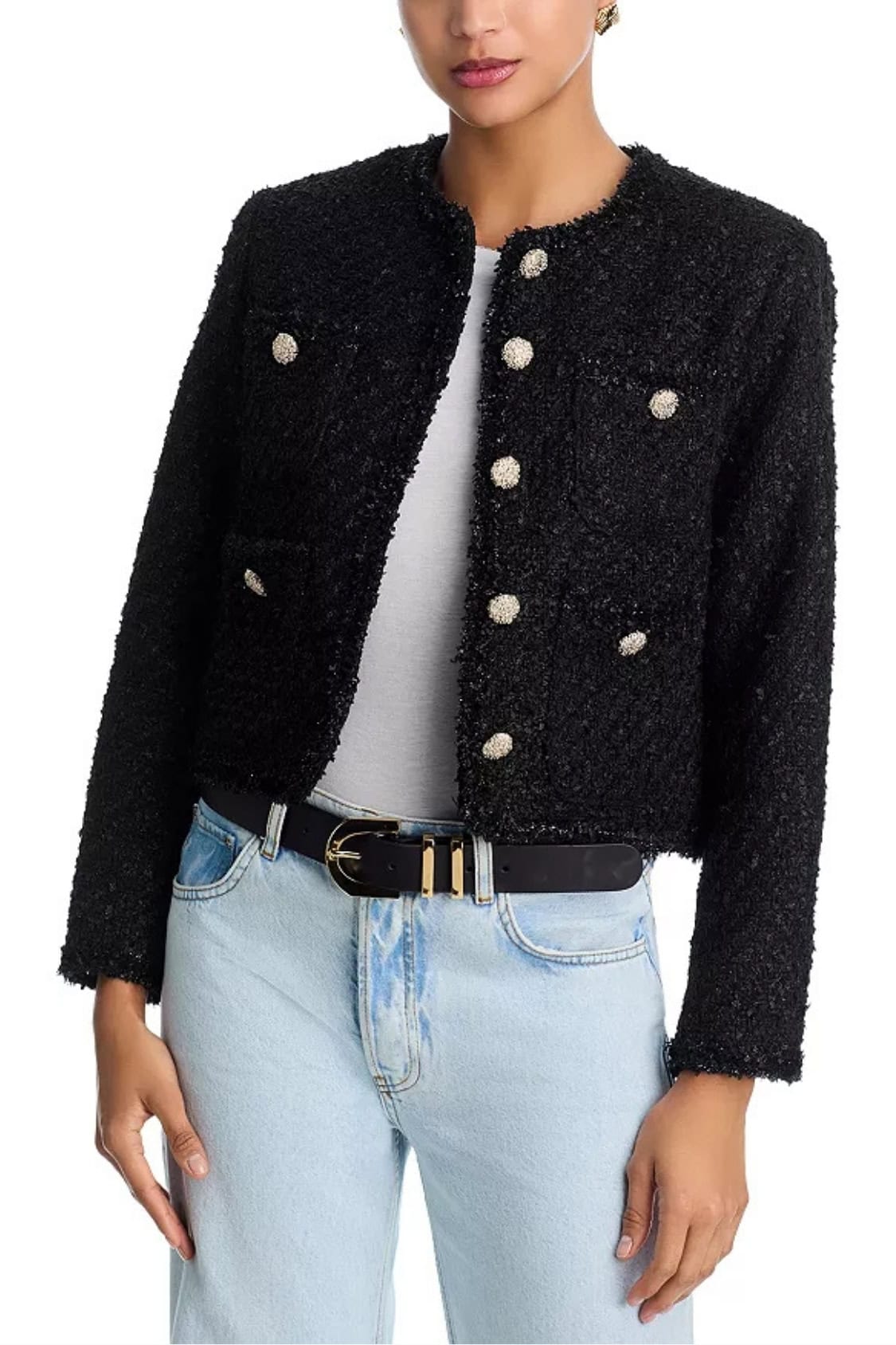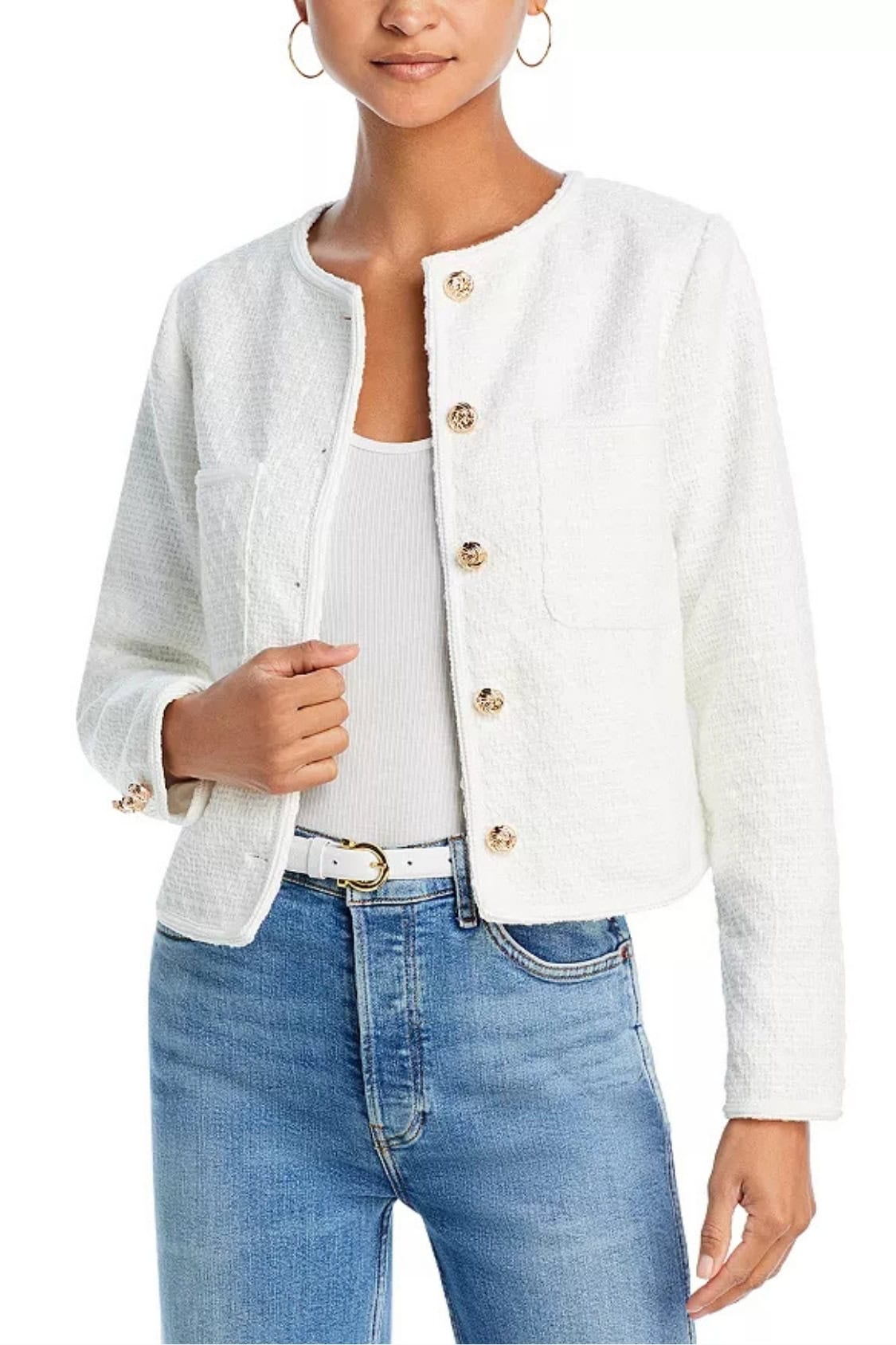The pocket details make this jacket utilitarian. But the big buttons add the Chanel touch. It’s chic and classic and a perfect alternative to denim jackets.