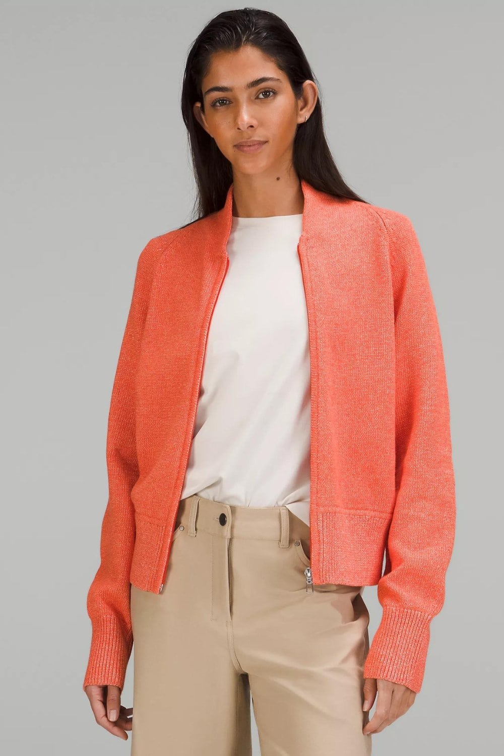 The zipped sweater jacket almost looks like a bomber jacket but does not look bulky or frumpy. Because it’s made out of knitted material, it’s lightweight and falls on your body perfectly. If you have a fuller chest, this casual jacket will still work for you. The zip details make it structured.